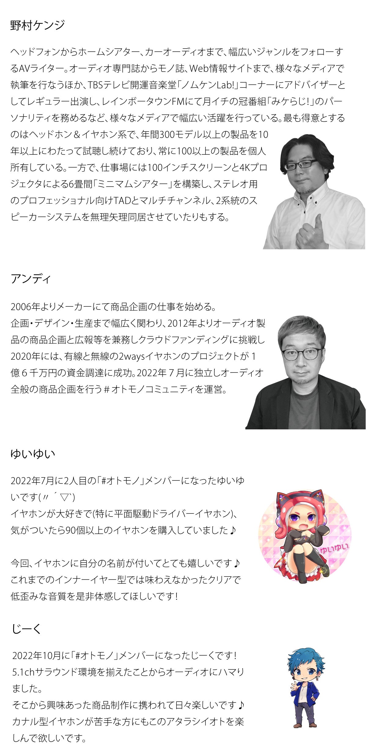 はじめまして、株式会社ベタベタの安藤(アンディ)と申します。私たちは「#オトモノ」というみんなで一緒に音にこだわったものづくりに挑戦していくコミュニティをオーディオの専門家の野村ケンジさんと一緒に運営しております。今回は、コミュニティの活動の中で生まれたインナーイヤー型の平面駆動(プラナー)ドライバーをクラウドファンディングすることになりましたのでみなさま応援を何卒よろしくお願いいたします。