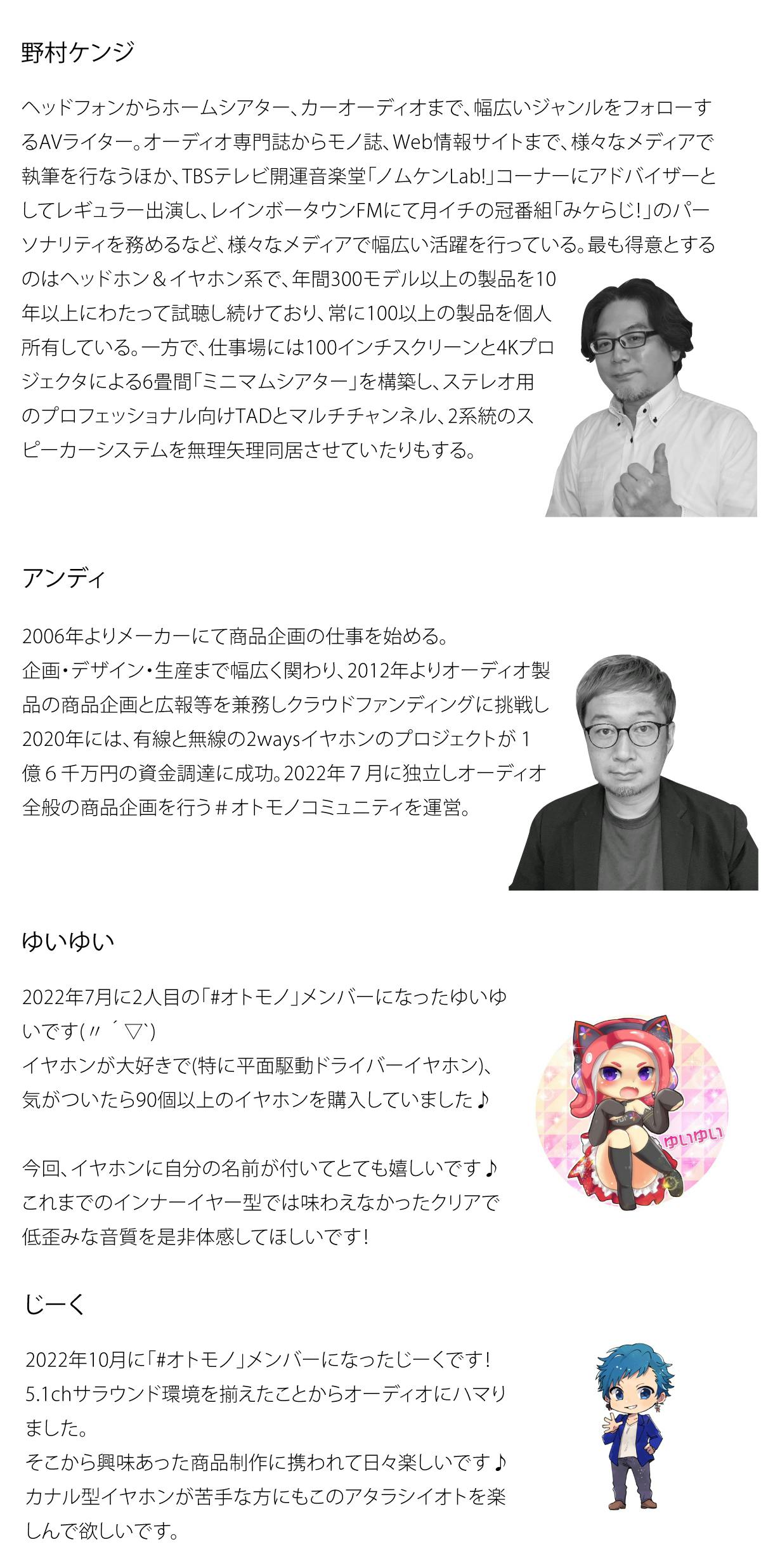 クラウドファンディングの興奮が忘れられず、いつかまたみんなでイヤホンを作る企画をスタートさせたいと常々思っていました。現在NYのオーディオブランドのADV.の日本でのブランディング担当や中国のオーディオ工場のマーケティング担当などいくつかお仕事をしています。そんな中で昨年2022年の7月に「#オトモノ」というコミュニティをスタートさせて、オーディオ好きなメンバーと一緒にものづくりをはじめました。