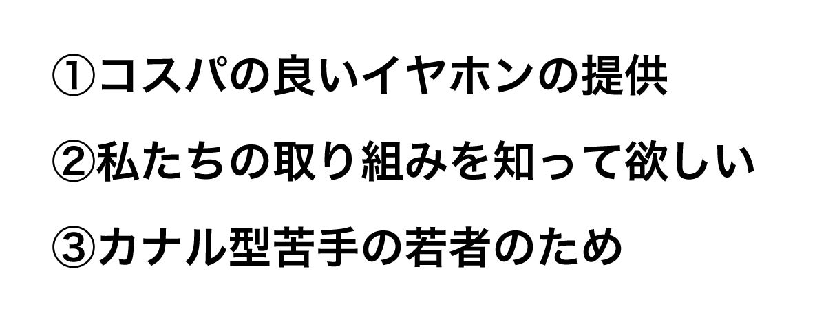 平面駆動ドライバーは、作ることも難しいので大変価格が高いです。私たちは、平面駆動ドライバーを作っているので、少ない数量での生産や低価格を実現しました。まずは第一弾商品として#オトモノ発&私たちのブランド「Initial A(イニシャル エー)」を知ってもらいたいです。第一目標は、まず100個を販売することです。