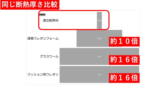 ぽかぽかシートが0.018(W/mK) 真空断熱材無しの場合が0.037(W/mK)と約2倍の断熱性能です。