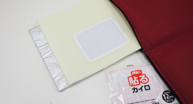 内部に使い捨てカイロで 貼るカイロ を添付します。折り畳み中央寄りに貼ることでお尻にちょうど良い場所にカイロが当たります。
