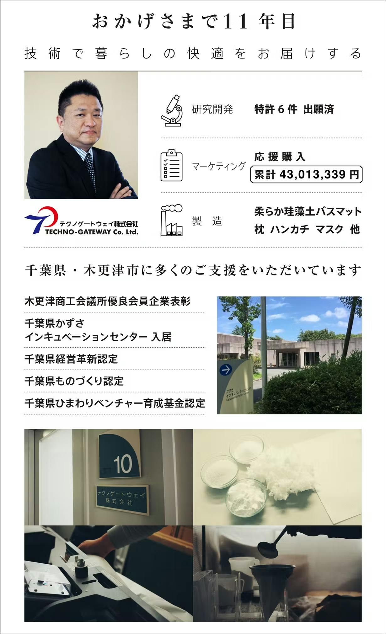 ここまでの道のりには色々なことがありました。 創業は2011年10月。そうです。この年は3月に東日本大震災があり、突然日常が日常ではなくなることを思い知らされました。 限りある人生、悔いなく皆様のお役に立ちたいとテクノゲートウェイ株式会社を立ち上げました。当初はタイランドに子会社を設立しHDD向けに日本の高性能樹脂をタイランドに輸出しておりましたが、SSDの台頭やダウンサイジングで市場縮小。2017年に子会社を売却し日本で化学の知見を応用した新製品の開発にチャレンジしました。 木更津市・千葉県の地域の方々から人的資金的に多大なるご支援をいただき、かずさインキュベーションセンターで、柔らか珪藻土等数々の新製品開発を実現し、国内のプラットフォームで応援購入を募りました。