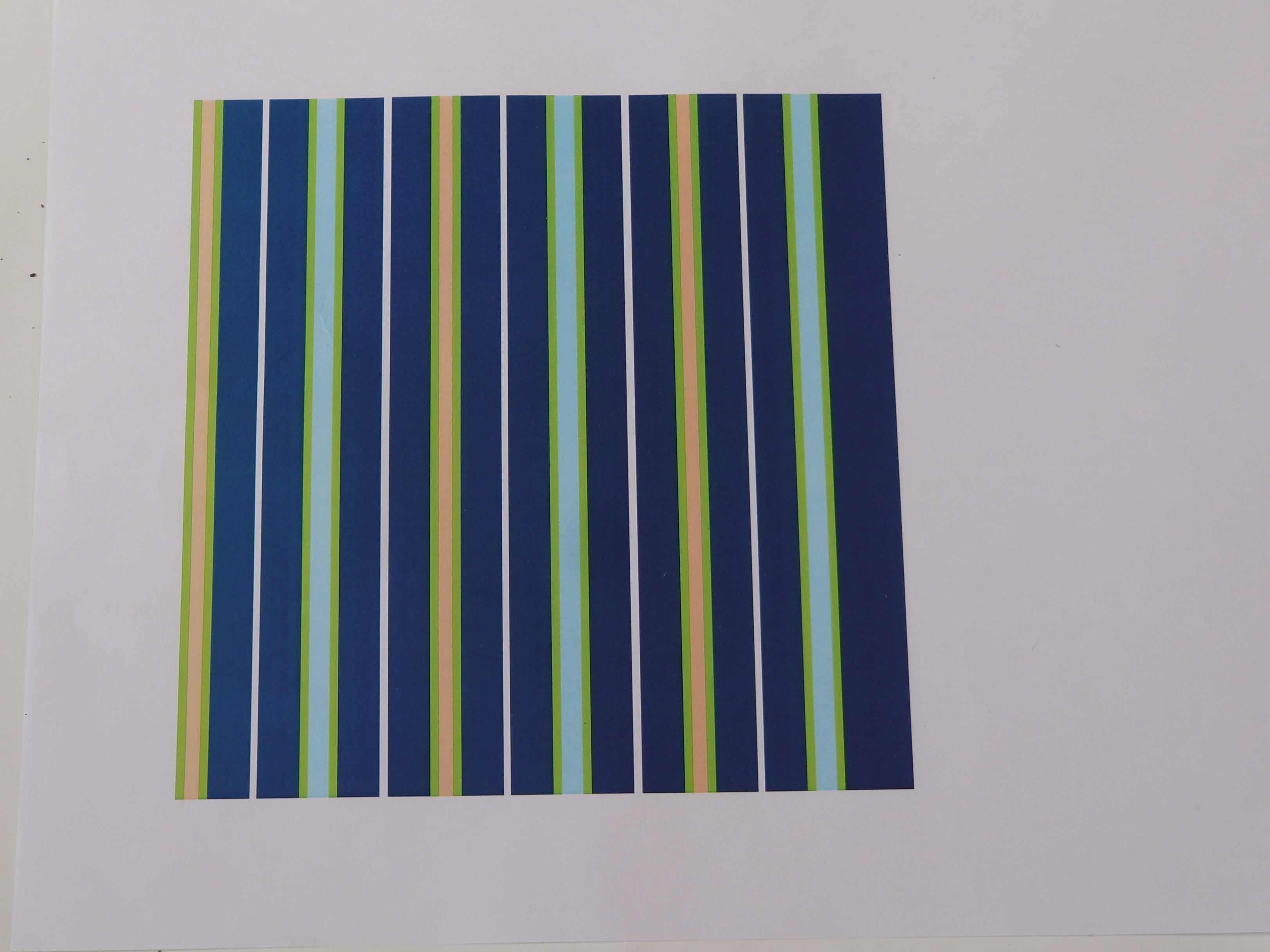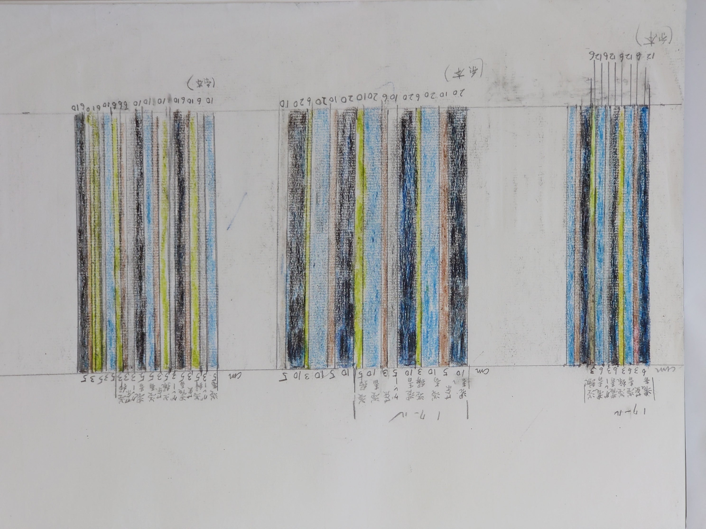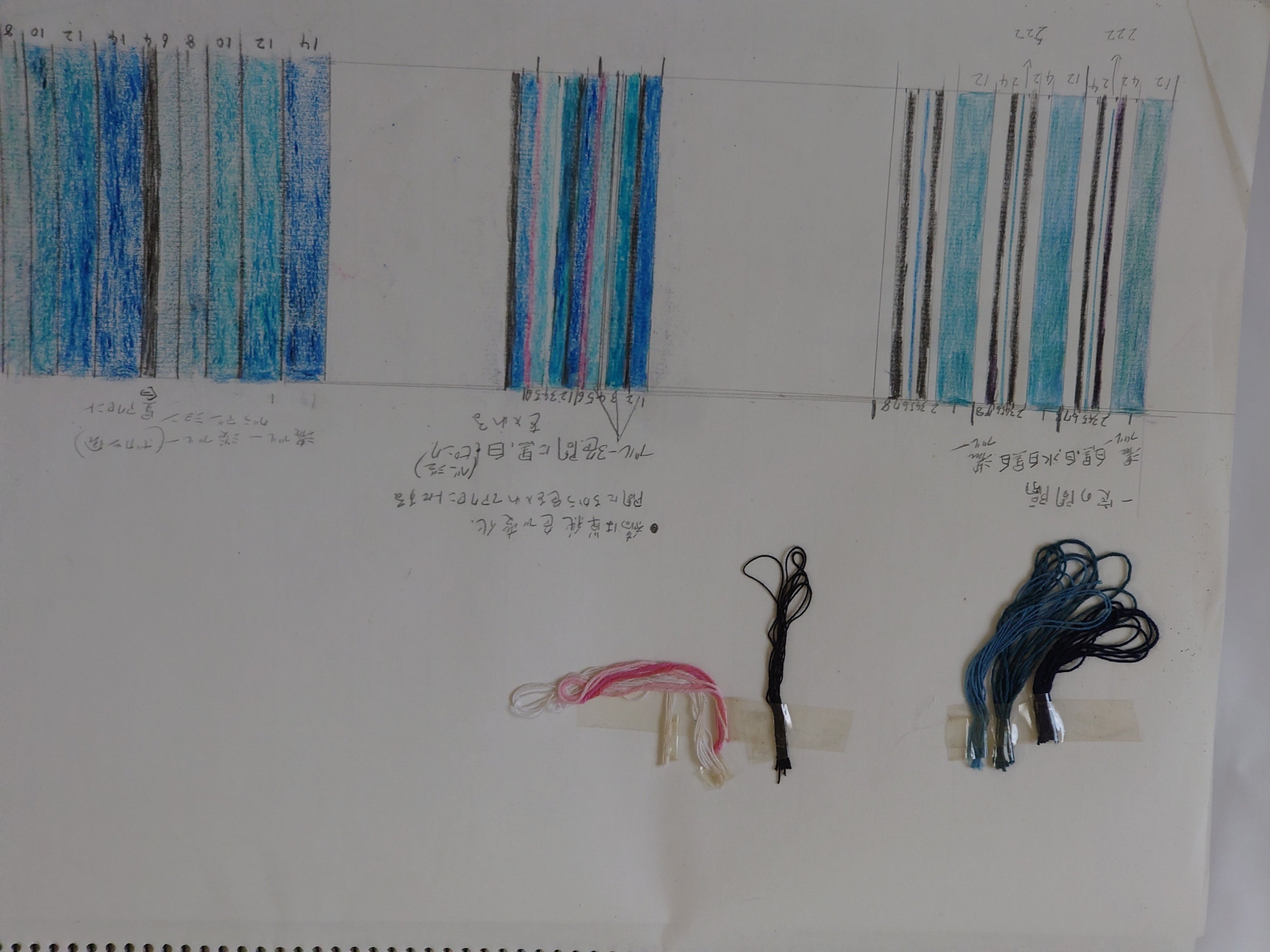 新しいデザインの縞を作成しています(機織りの分野では『整経』(warping)と呼ばれる工程です)。『整経』は織物の経糸(たて糸)を準備する工程です。