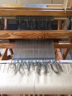 新しくデザインされた縞の上総木綿の織り工程です。経糸を織り機にかけ、杼(ひ)シャトルという道具で経糸(たていと)の間に緯糸(よこいと・ぬきいと)を通し織物が織られていきます。