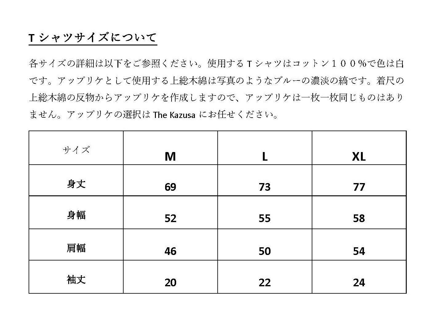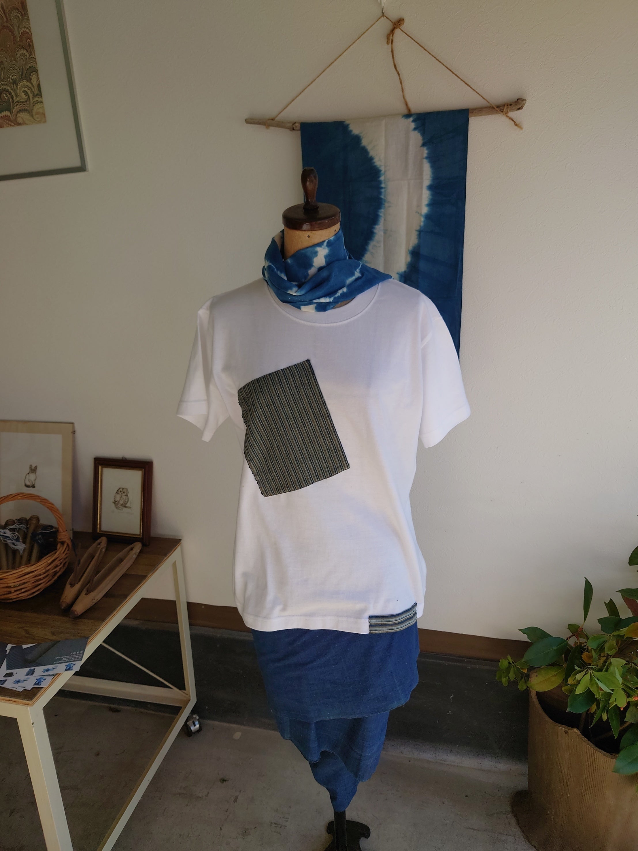 「藍」で染めた手ぬぐいと上総木綿がアクセントになっているTシャツ。白いTシャツ(コットン100%)に上総木綿をアップリケのようにぬいつけました。TシャツのサイズはM, L, XLです。上総木綿は手織りのため1枚づつ色や柄が異なりますのでご了承ください。