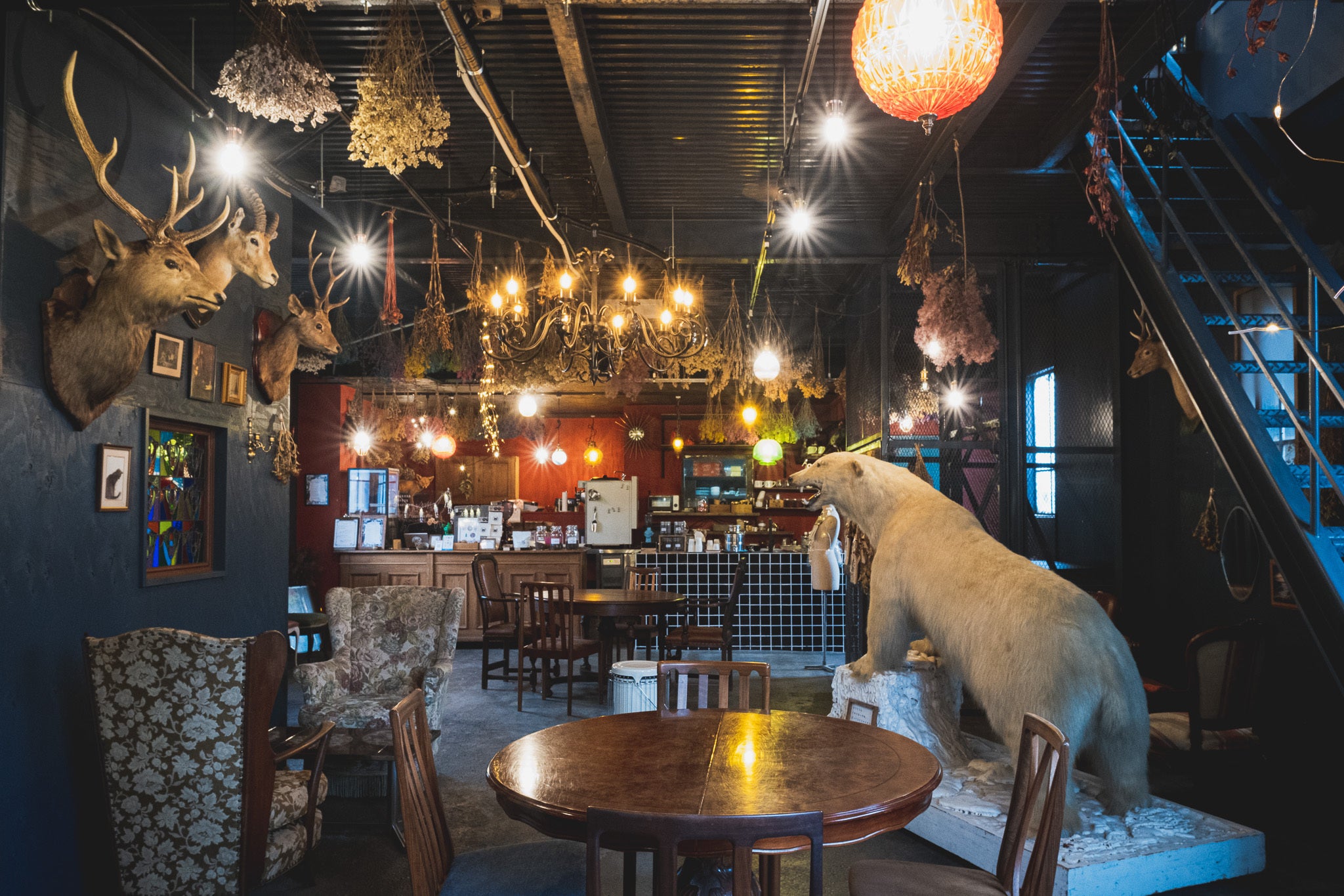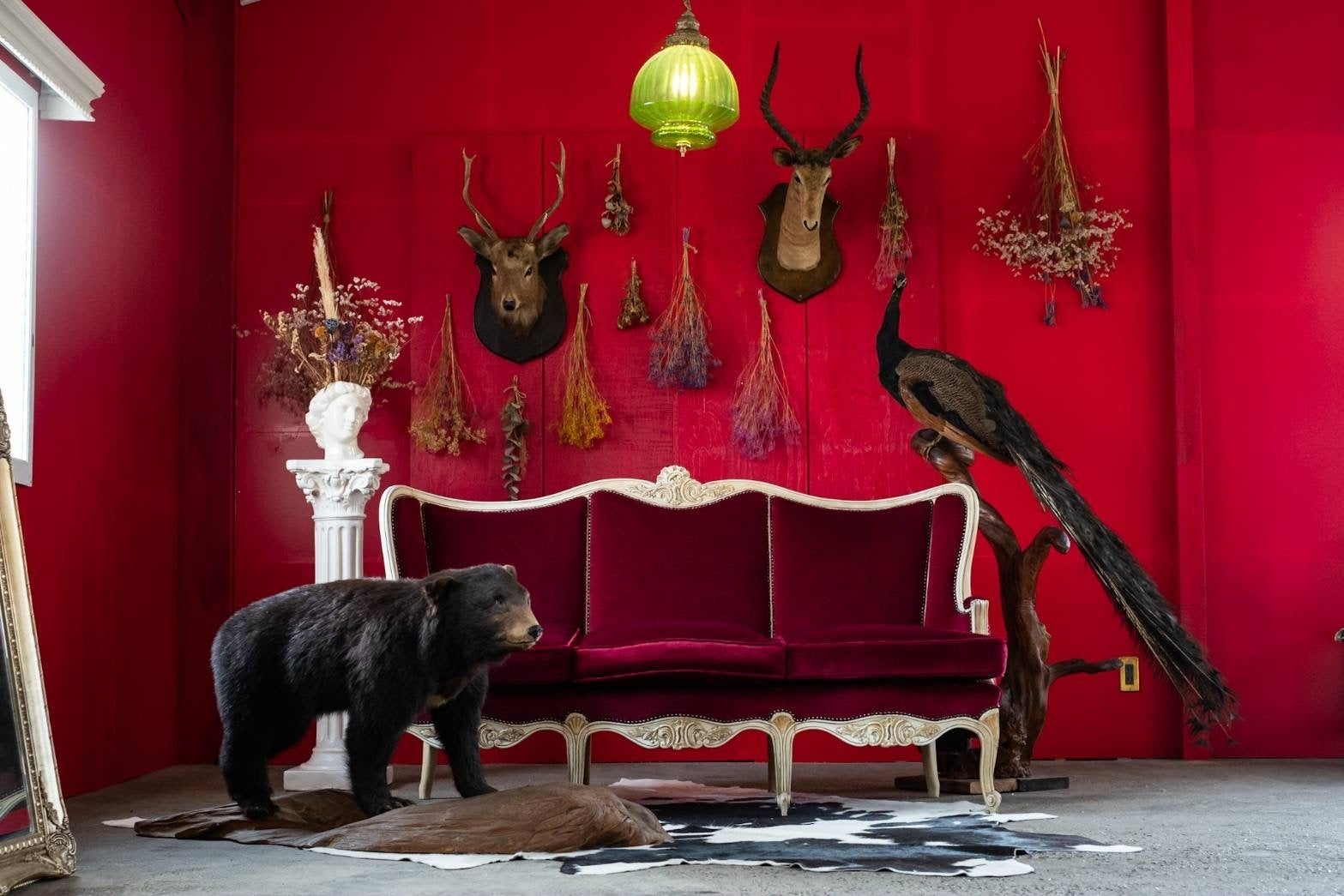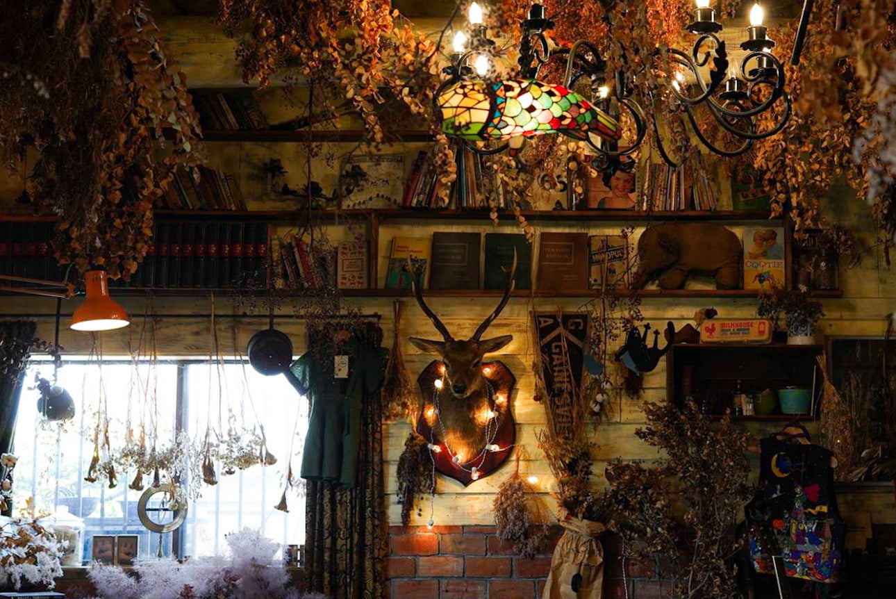 インテリアは主にアメリカやヨーロッパのアンティークで揃え、ドライフラワーや剥製などで装飾しています。