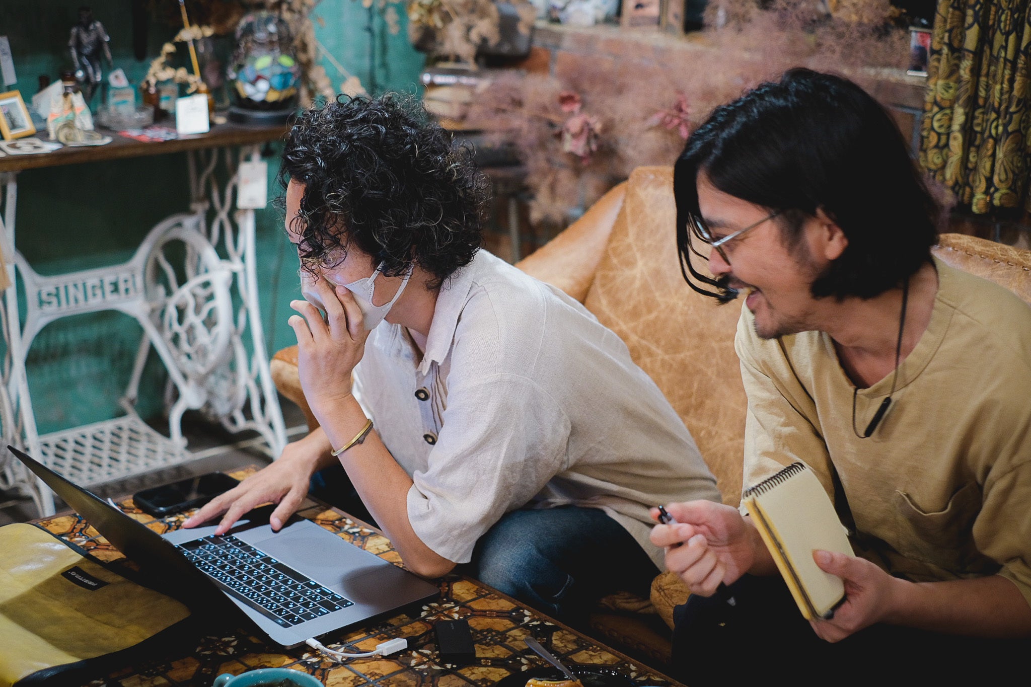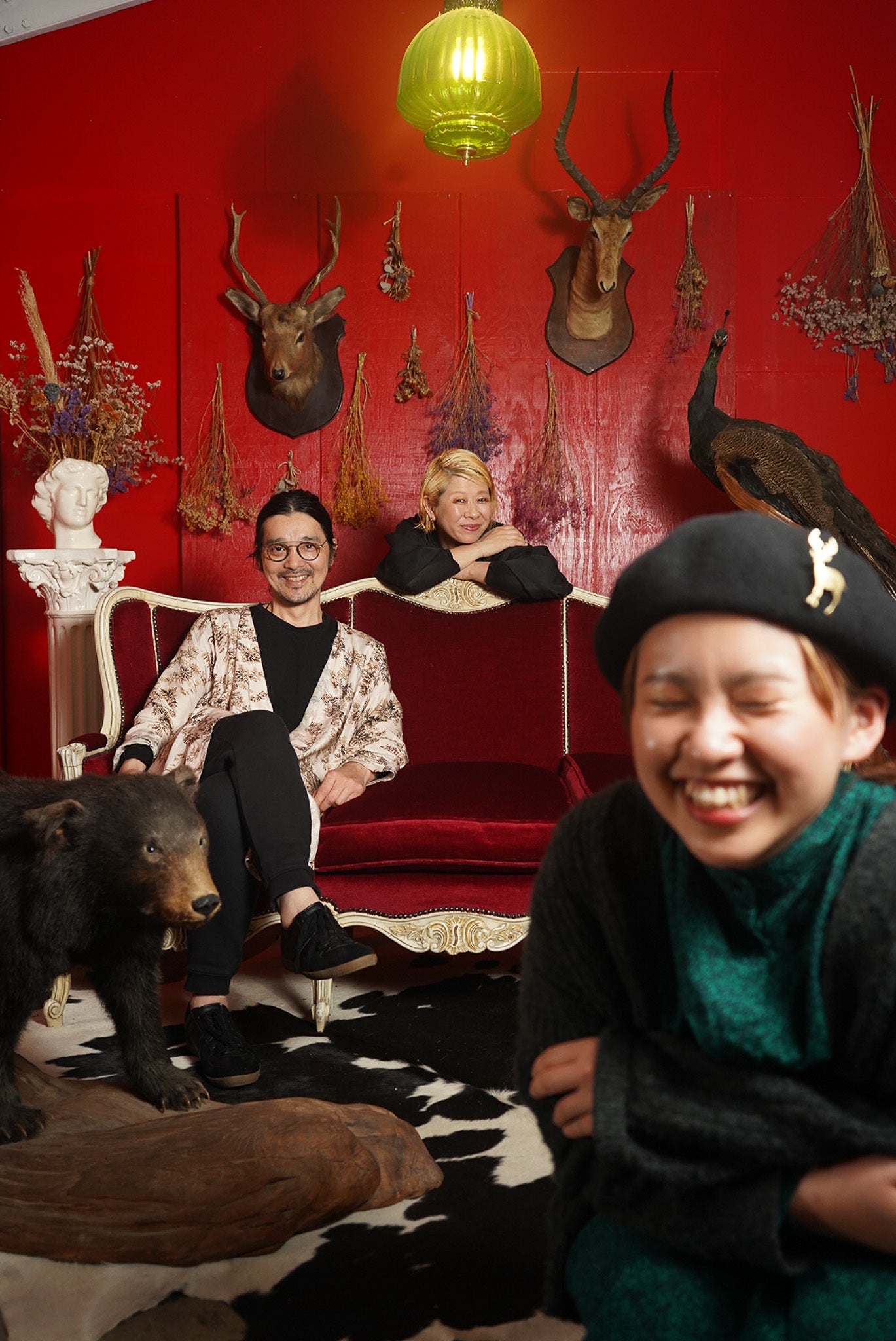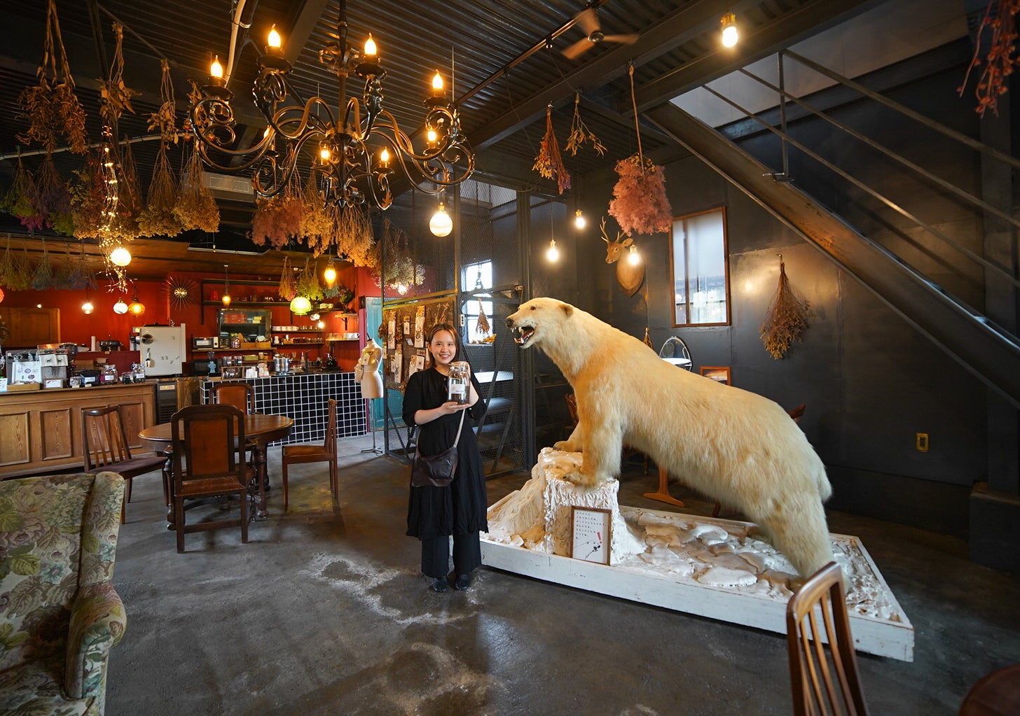 インテリアは主にアメリカやヨーロッパのアンティークで揃え、ドライフラワーや剥製などで装飾しています。
