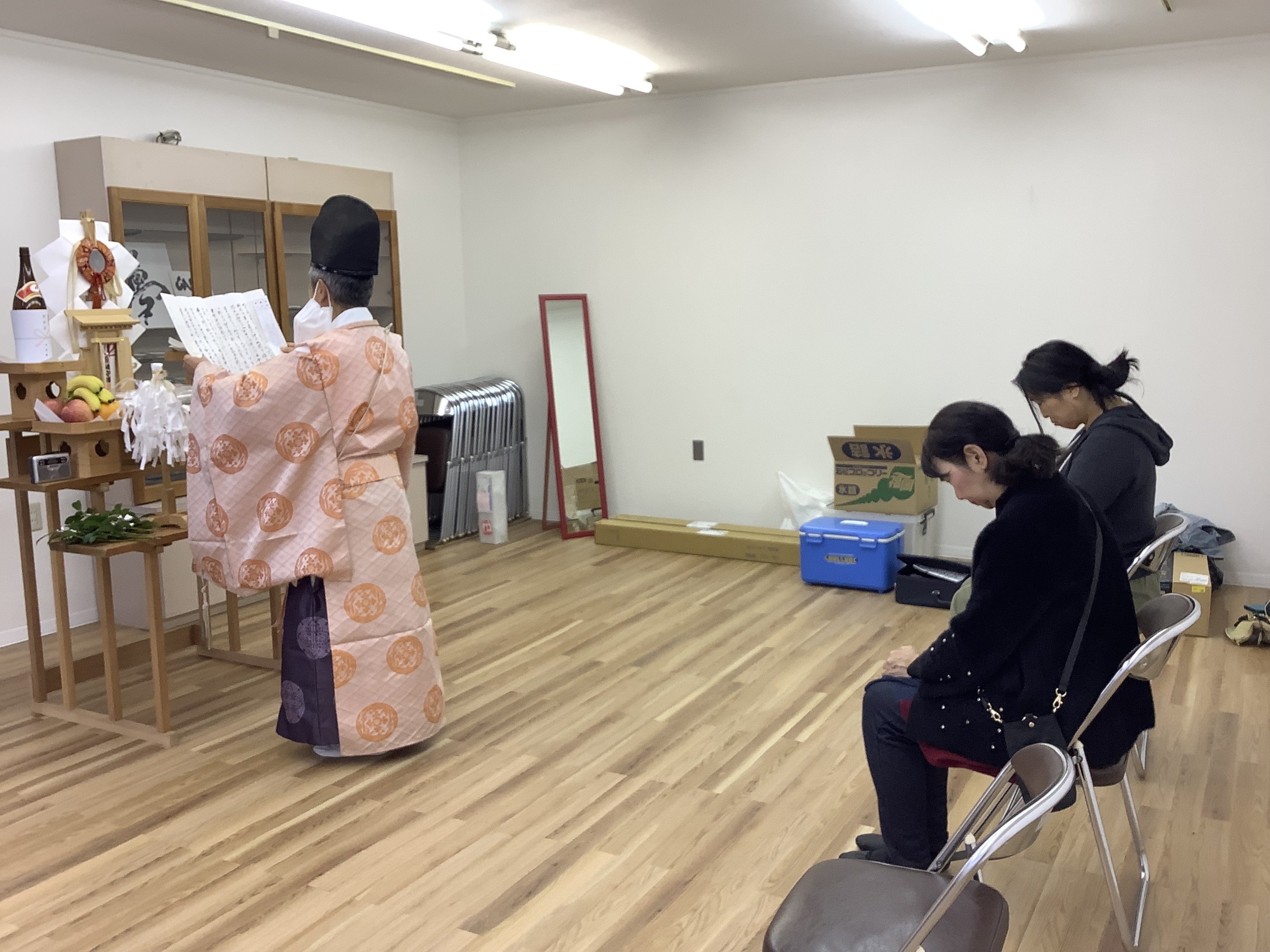 新築の家を建てる時とか工事が入る前の地鎮祭はみたことがありますが、祭壇を祀ってお祓いをして頂くのは初めての経験です。