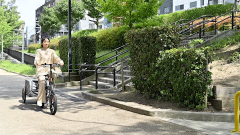 ※本プロジェクト内で使用されている画像は全て撮影用に特別に許可を得て歩道、公園内を走行しております。 通常時は手引モード以外の自転車牽引時は軽車両扱いになりますので車道の走行となりますのでご注意ください。