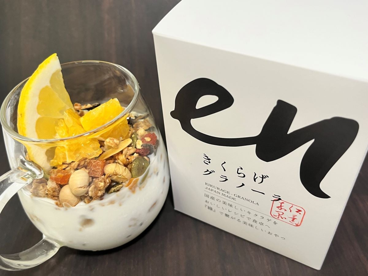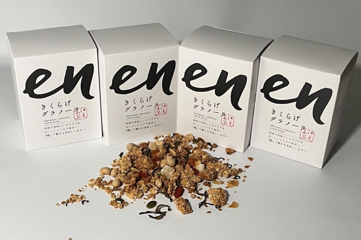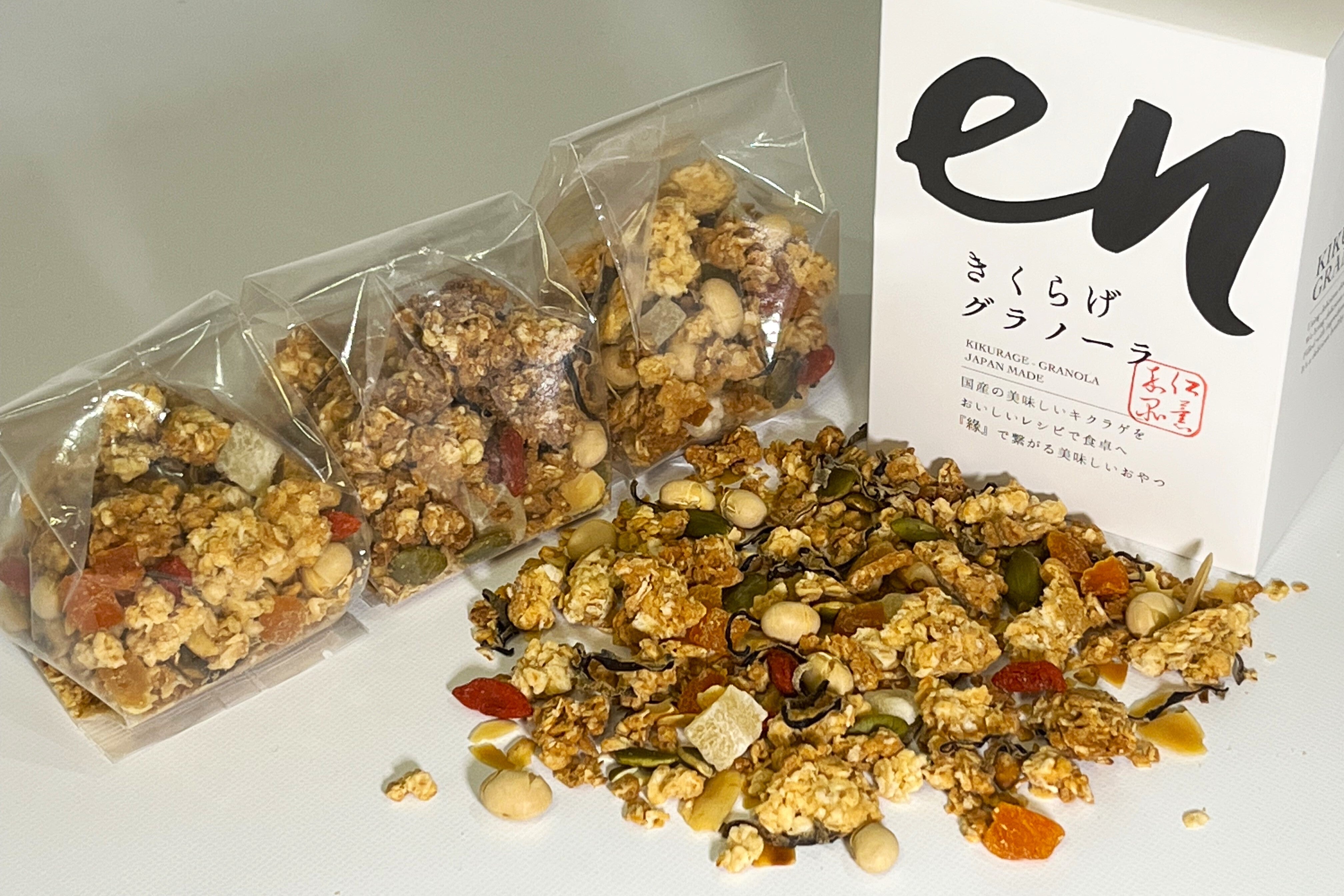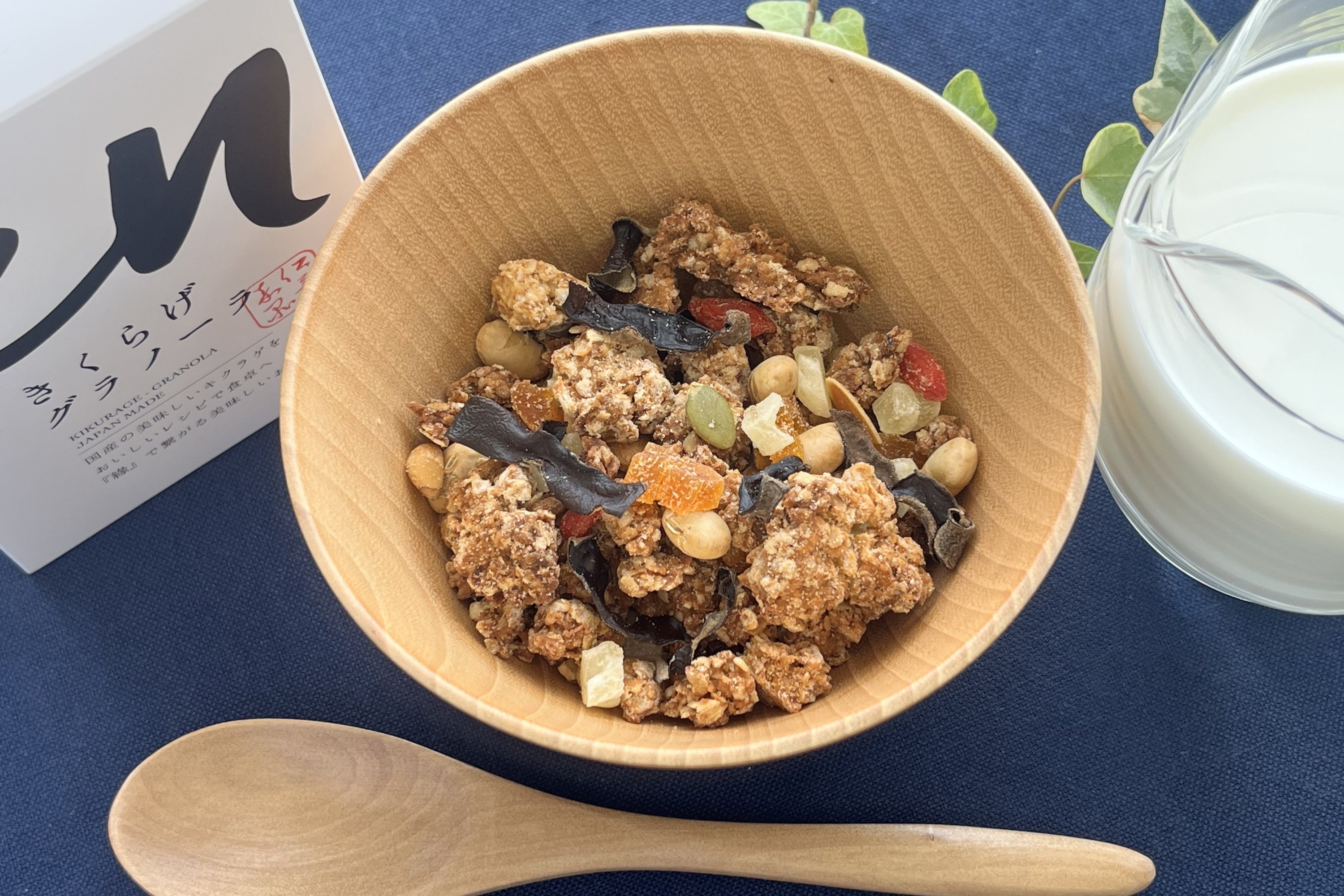 オーツ麦、蜂蜜、米粉、ココナッツオイル、あんずやパインのドライフルーツ、大豆、かぼちゃの種、アーモンド、松の実、クコの実等の十数種ものバランスの取れたグラノーラ原材料に、ビタミンⅮそして食物繊維や鉄分が豊富な国産きくらげを加えることでよりヘルシーなグラノーラを実現しました。