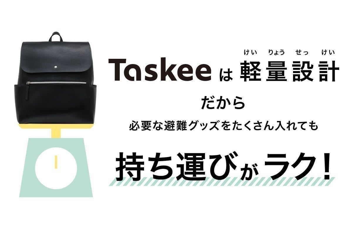 災害時の備え、避難グッズセットの第一歩として「 Taskee 」防災バッグはお勧めです。