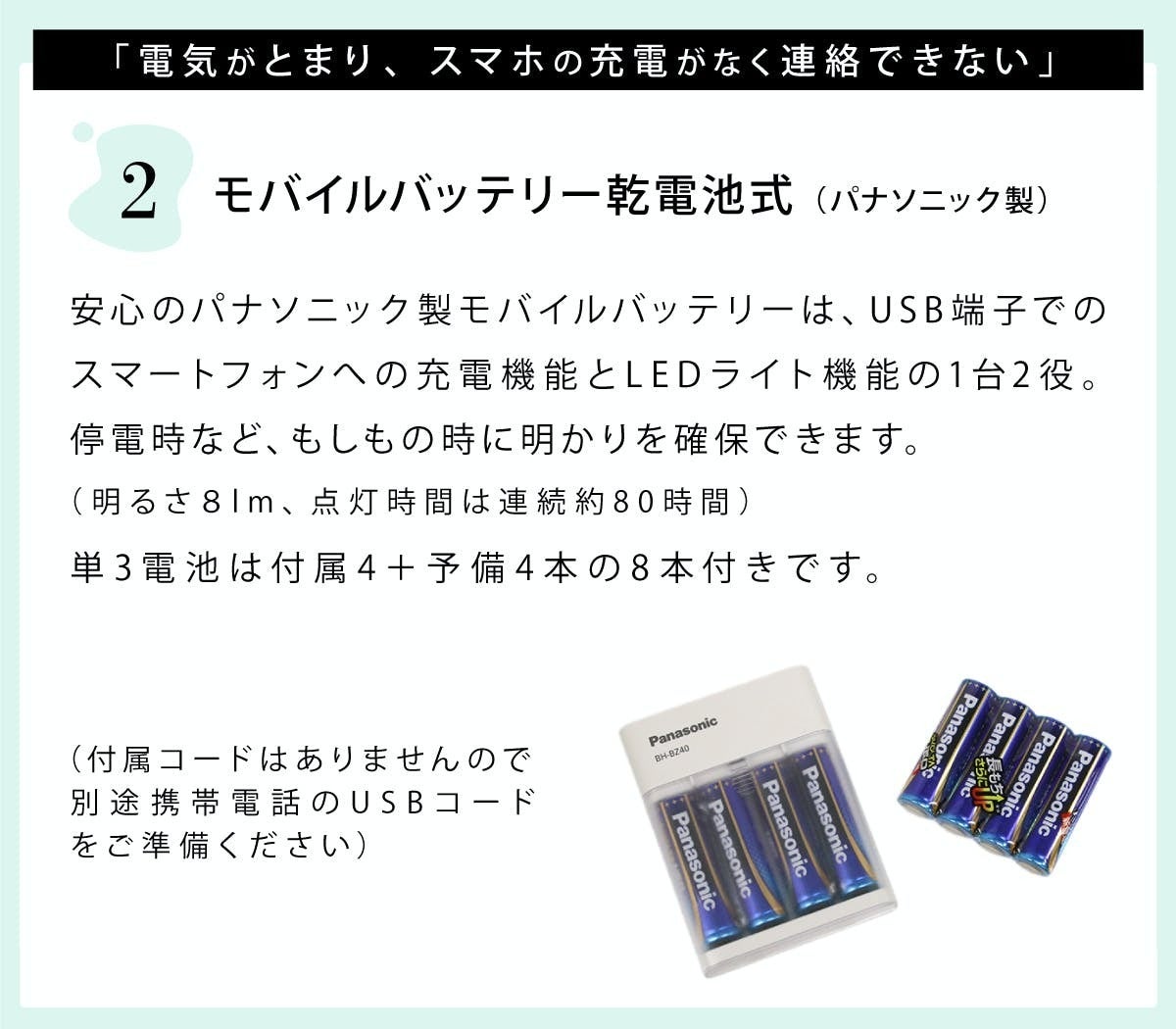 2. パナソニック製モバイルバッテリー×1(単三電池8本付)