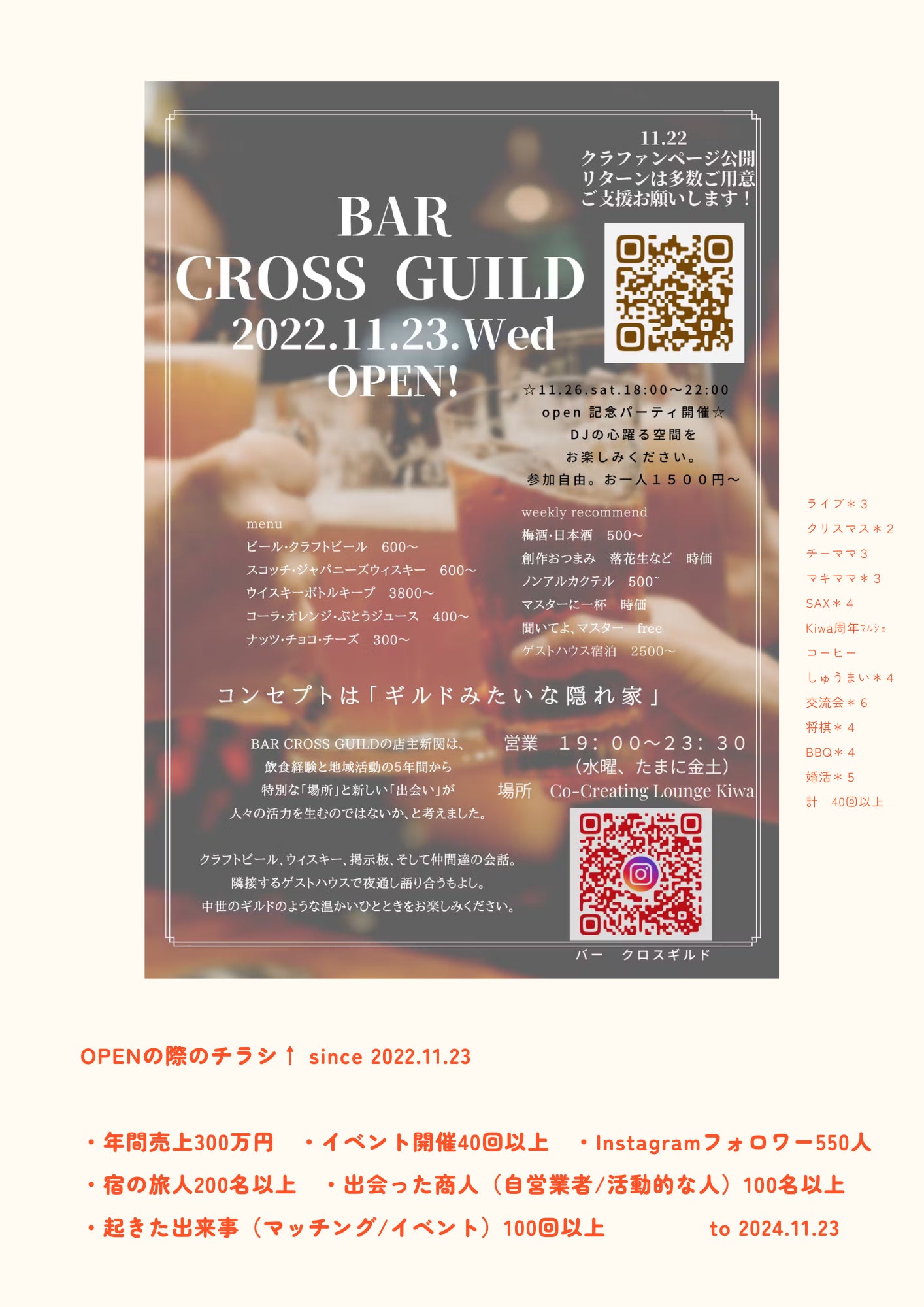 「BARで地元を盛り上げたい!」2022年11月23日に皆様の支援を受け開業しましたBARクロスギルドはこの度、2周年の日をもって閉店することとなりました。出会えるBARとして地域の常連さんや外からの旅人との沢山の「出会い」が生まれ、「いい場所だね」と嬉しい言葉を頂くことができました。このカウンターに立てたことを誇りに思います。