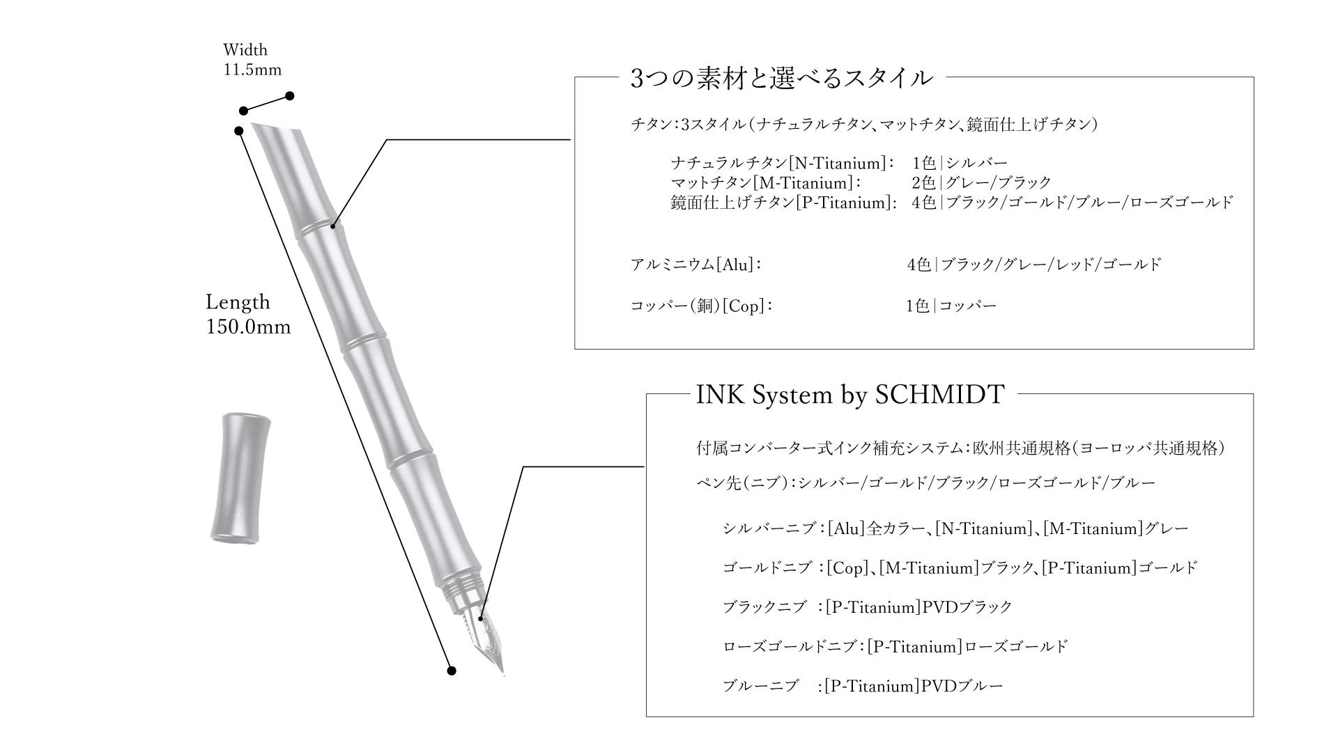 「TTi-110」はチタン・アルミ・コッパー(銅)の3種のモデルから選べるバンブーフォルムの万年筆です。