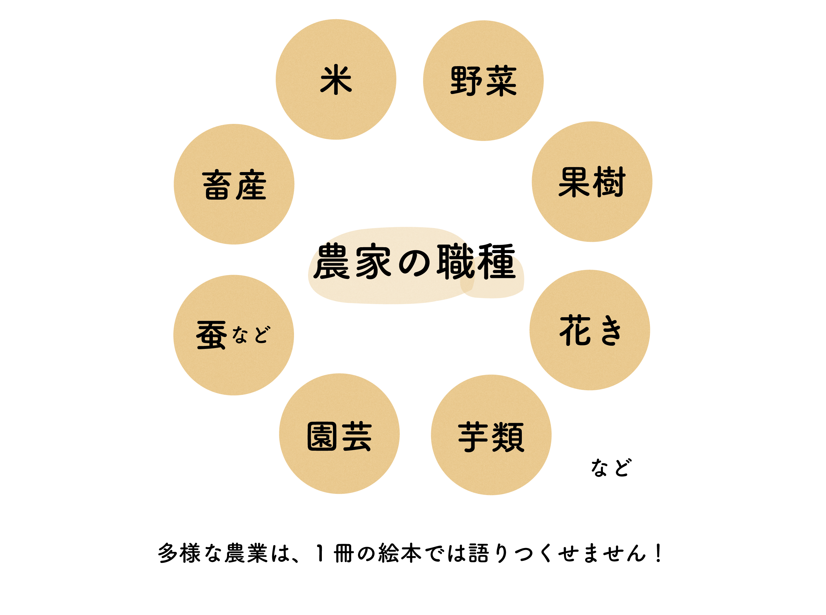前回のプロジェクトでは田んぼや畑がでてくる絵本をつくることができましたが、農業には本当にいろいろな作物や家畜などの職種があります。とても1冊の絵本では伝えきれません!