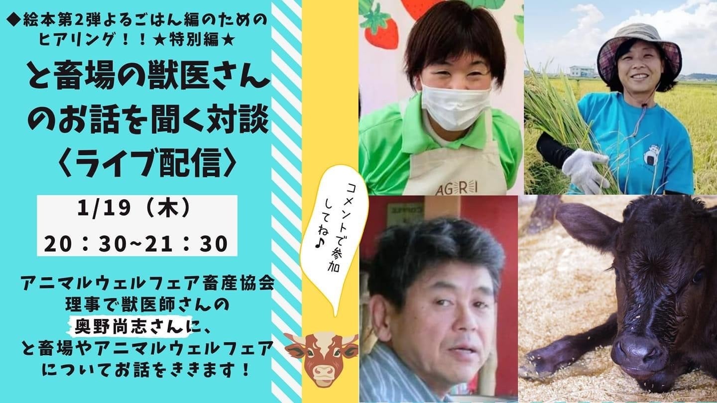 絵本第2弾「よるごはん編」のためのヒアリング!!特別編【と畜場の獣医さんのお話を聞く対談〈ライブ配信〉】1/19((木))20時30分~21時30分くらいまで▼配信先Facebookhttps://www.facebook.com/agribatonprojectYou Tubehttps://youtu.be/QA9e5ZSSWEg獣医師として北海道帯広食肉衛生 検査所に勤務されている奥野 尚志さんより、普段、なかなか伺えないと畜場での動物の様子や管理についてお伺いします。また、奥野さんは、(一社)アニマルウェルフェア畜産協会、理事・事務局長もされており、アニマルウェルフェアの観点でのと畜場の実情についてもふれて頂きます。参加者●奥野 尚志さん(と畜検査員、食鳥検査員、一般社団法人 アニマルウェルフェア畜産協会、理事・事務局長)●横田 祥(AGRI BATON PROJECT 代表、有限会社横田農場)●芳賀 あゆみ(AGRI BATON PROJECT Runner本部、株式会社芳賀にこにこ農園 運営)AGRI BATON PROJECTとは・・・「農業は楽しい!」を子どもたちへ伝える絵本「あさごはんのたね」を製作出版し、地元農業女子による食農教育活動を全国展開するオンラインコミュニティ。絵本という誰にでも取り組みやすいツールを使い、食農教育活動を取り組みやすいものとして全国へ広げている。2030年、農業を子どもたちのあこがれの職業にすることが目標。2023年 AGRI BATON PROJECT『新春特別対談』\\\\食育絵本第2弾【牛飼いさん 絵本】を製作するためのクラウドファンディング応援お願いします////「農業は楽しい!」を子どもたちへ伝える絵本プロジェクト第2弾!【牛飼い農家さんが子どもたちにおくる絵本プロジェクト】過去の牛飼いさん達に伺った10回のインタビュー動画は、YouTube再生リストにアーカイブがあります。https://www.youtube.com/@agribatonproject4509/streams#食育#食育絵本#命をいただくこと#牛#牛飼い#農業は楽しいを伝える絵本プロジェクト#agribatonproject#アグリバトンプロジェクト#よるごはん#農業女子