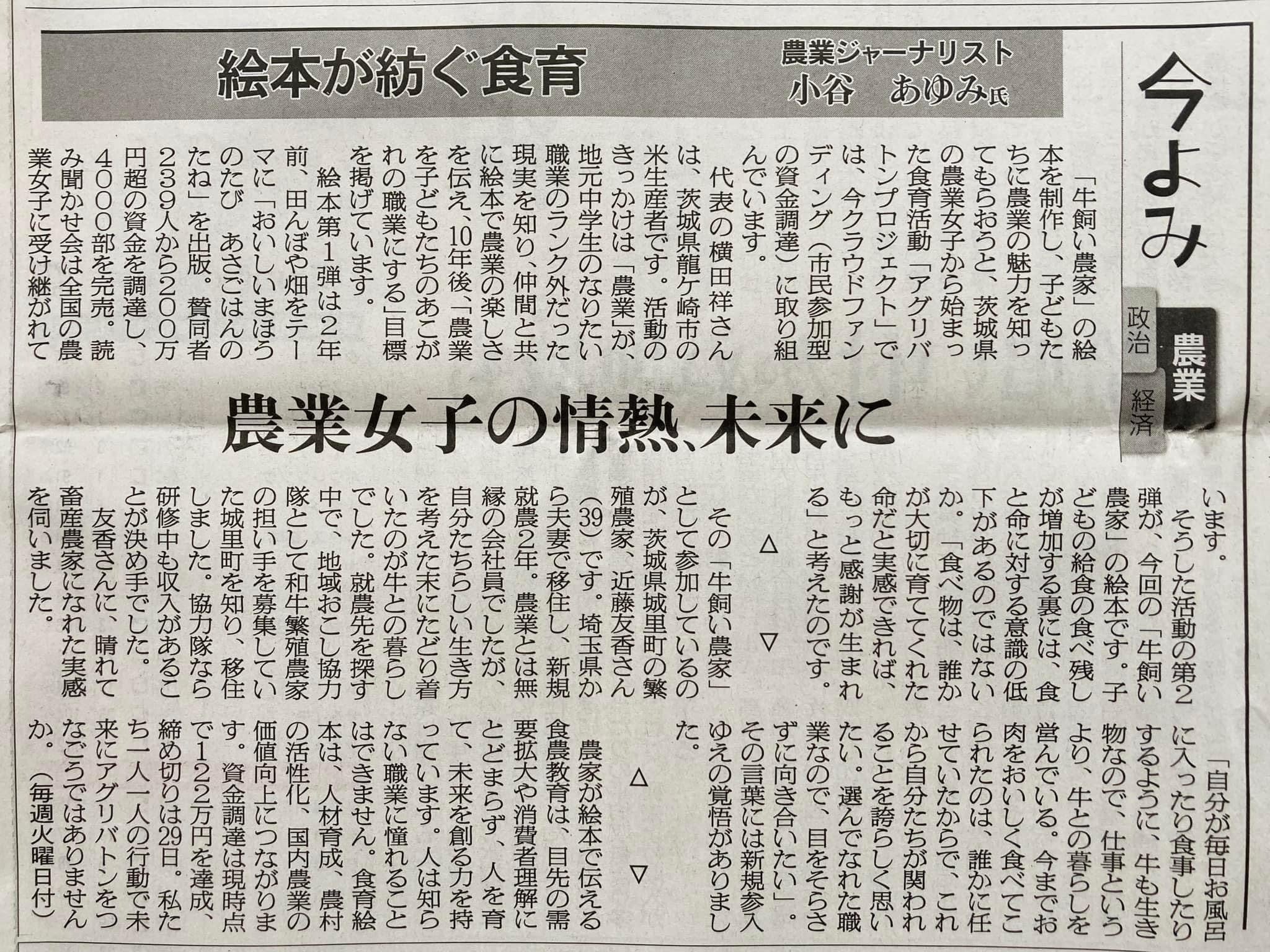 野菜を作るアナウンサー「ベジアナ」の小谷あゆみさんが、日本農業新聞のコラムに、AGRI BATON PROJECTのクラウドファンディングのことを綴って下さいました!クラウドファンディングへの応援メッセージも頂いてます。対談でも素敵なお話を聞かせてくださいました。いつも、応援ありがとうございます!https://www.facebook.com/ayumi.kotani.35