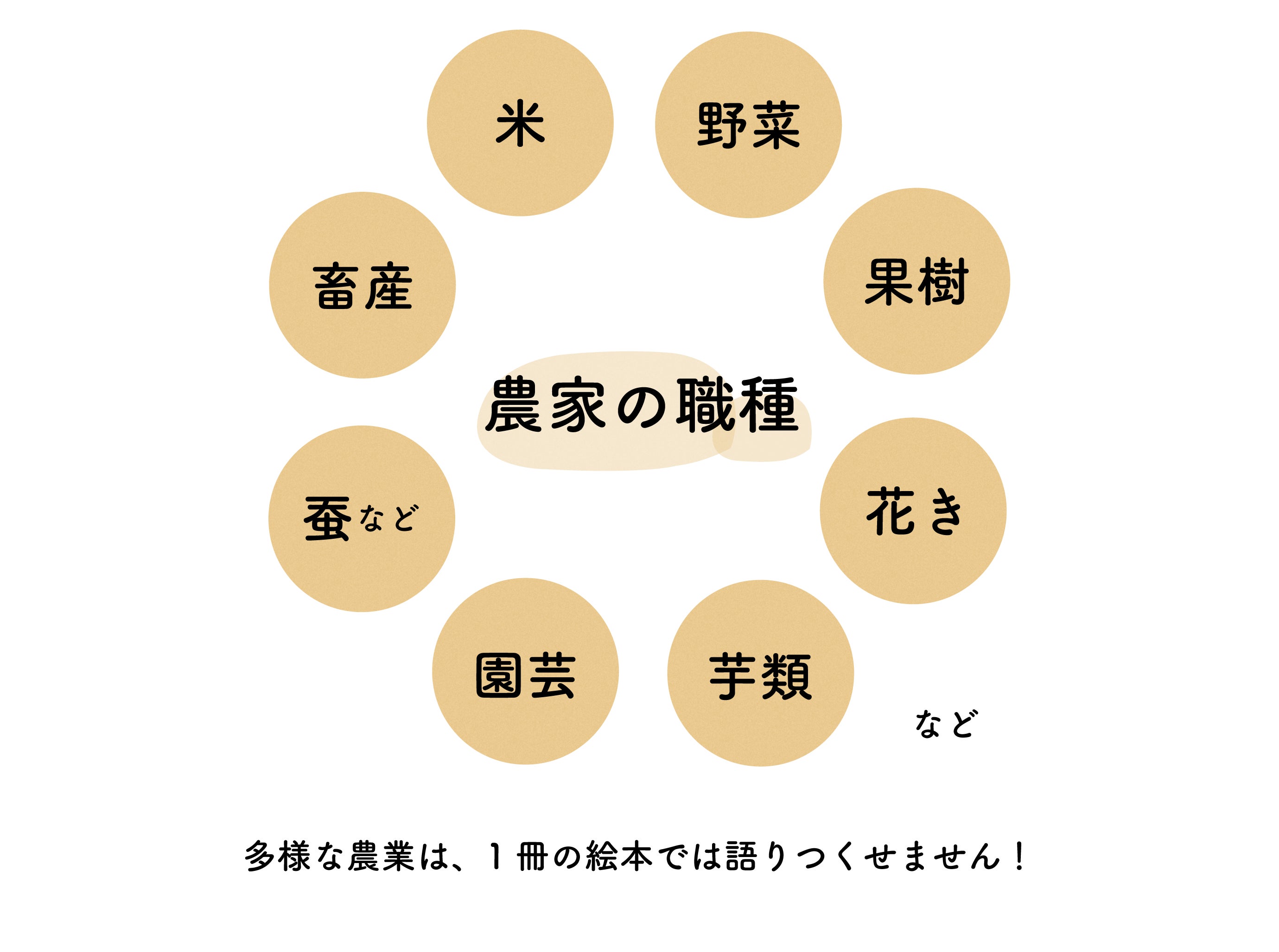 前回のプロジェクトでは田んぼや畑がでてくる絵本をつくることができましたが、農業には本当にいろいろな作物や家畜などの職種があります。とても1冊の絵本では伝えきれません!