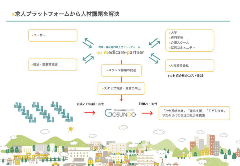 私たちは、求人プラットフォームの売上金の一部を、福祉団体の日本未来福祉サービスGOSUNDO[ごさんどう]を介して、医療・福祉人材の育成や社会貢献活動に活用し「次の世代に繋がる業界の担い手」の育成に取り組み社会課題を解決していきます。