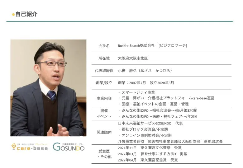掲載予定期間:2023年6月〜2026年5月まで あなたの企業名をPRできます。 Busifro-Search 株式会社の代表取締役 小笹勝弘から熱いお礼のメール付き! https://care-base.jp/