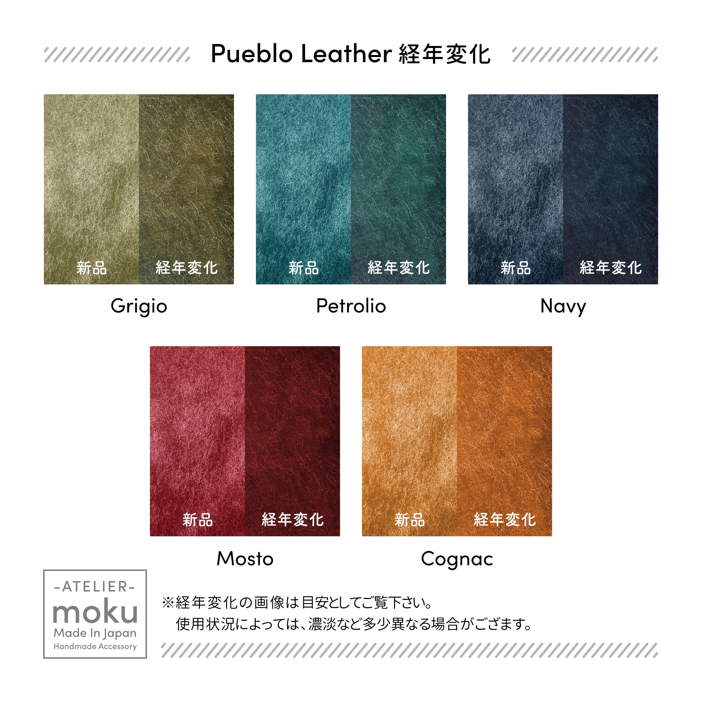 イタリアの染色技術によって染色されているので、透き通るような綺麗な色でありながら、ハリのある重厚感が魅力です。プエブロほど劇的ではないものの、経年変化も楽しめる皮革です。
