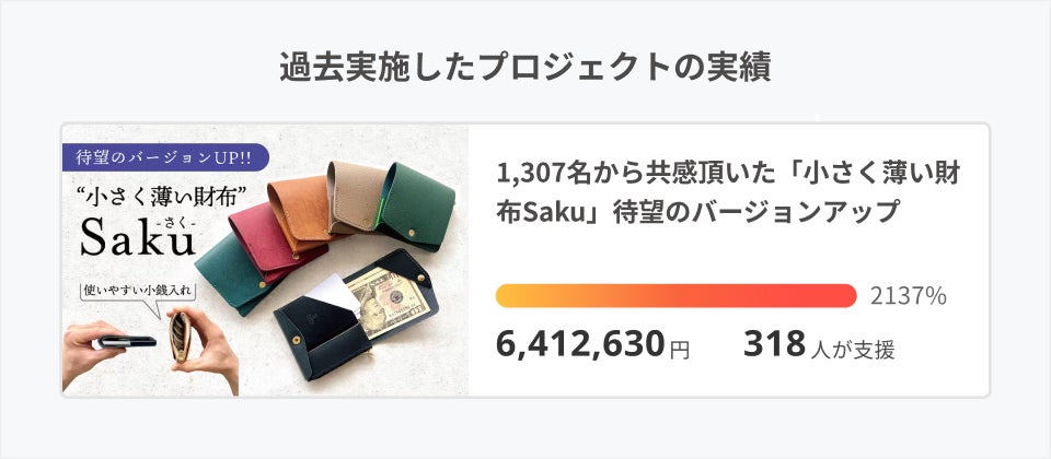 今回はver.1とver.2で累計支援総額3,000万の「小さく薄い財布Saku(ver.2)」の復刻プロジェクトになります。