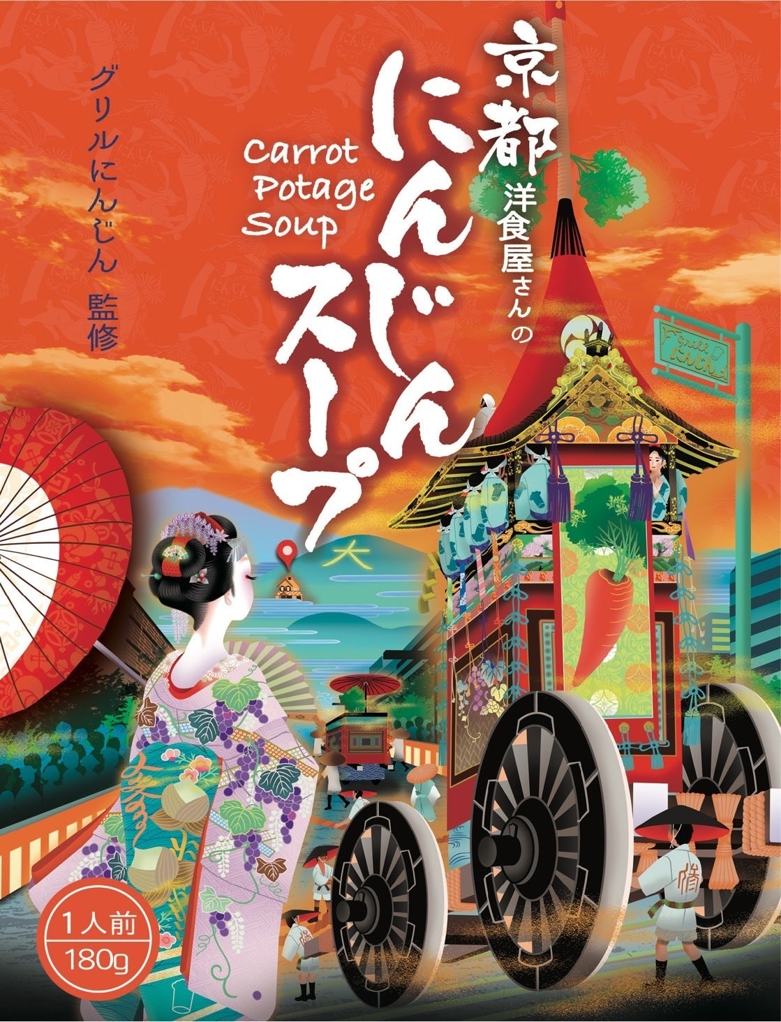 パッケージデザインは、艶っぽい京都の景色。コロナ禍で開催が何度も見送られた、京都の祇園祭りをテーマにデザインしていただきました。デザイナーは、絵師の安西 智氏とディレクターの島 直也氏からなる、人気絵描ユニット「だるま商店」さん。彼らの絵は、京都の六道珍皇寺や妙心寺、随心院など名だたる寺社に飾られています。既に発売しているレトルトパッケージも、全てだるま商店さんによるもの。今回も、当店の看板や外観がデザインの中に盛り込まれていて、遊び心満点のデザインになっています!