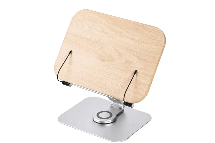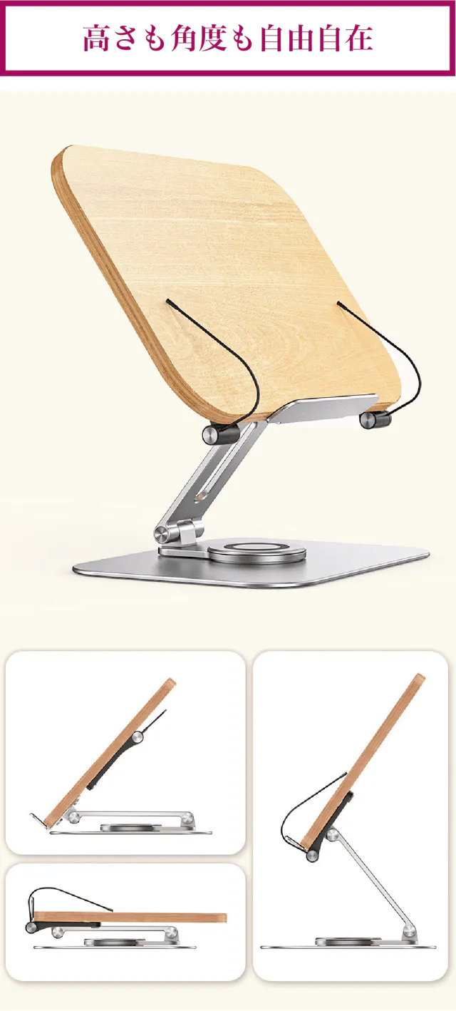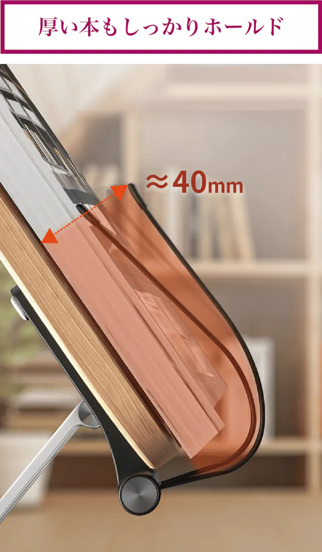 【リブレリア】は高さも角度も無段階に自由調整できますので、あなたの目の高さにぴったり合った位置に本を固定できます。使わないときは折りたたんでおくとスペースを取りません。