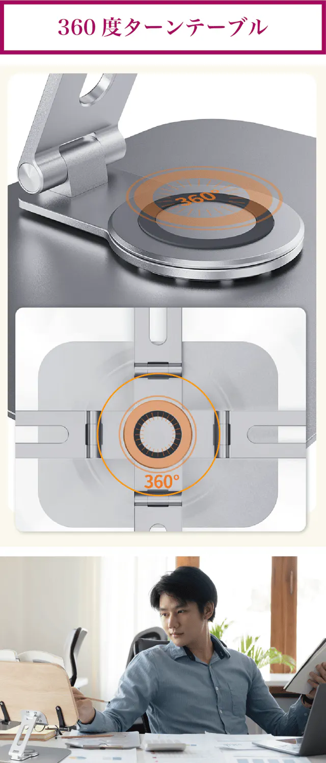 【リブレリア】は360度ターンテーブルなので、どの方向にも簡単に本の向きを変えられます。作業中にも本や資料を必要な向きにできるので便利です。
