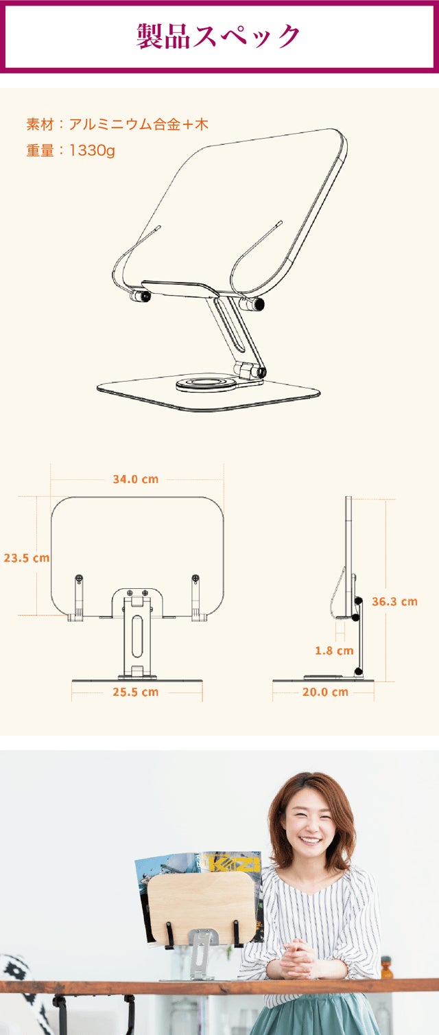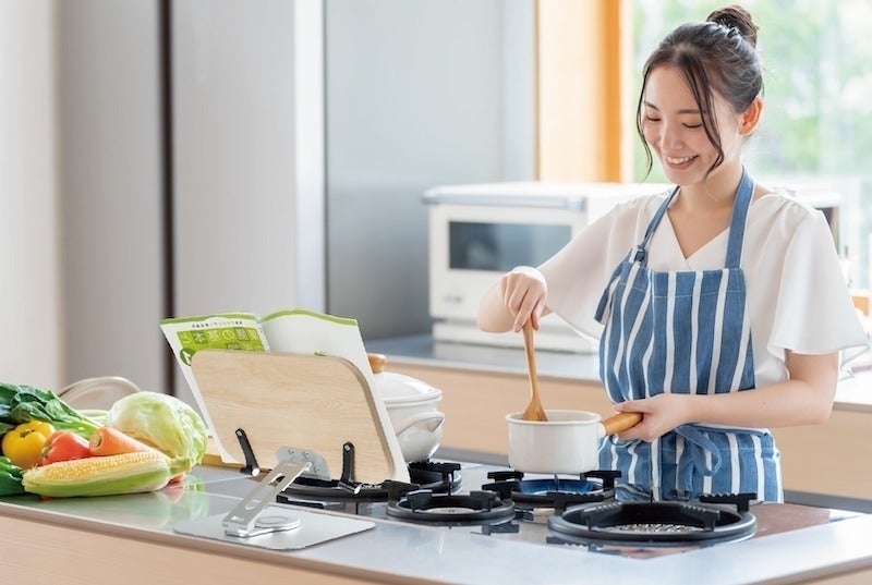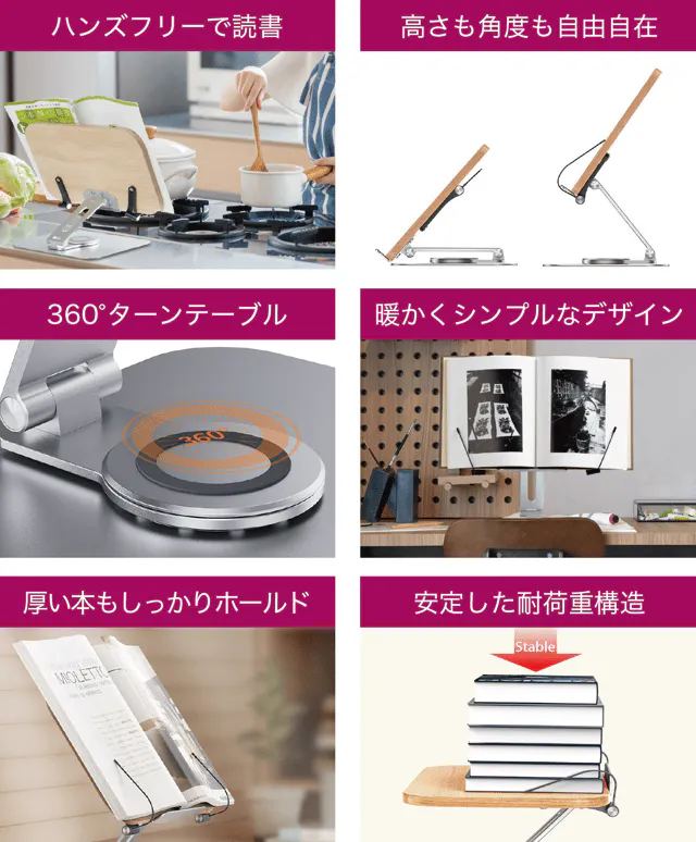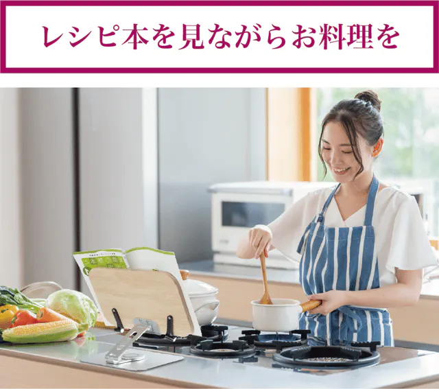 【リブレリア】は両手をふさがないので、レシピ本を見ながらお料理をすることも。料理だけではなく、本やタブレットを参照しながら仕事、勉強、料理、演奏、お子様と遊びをするなど、いろいろなシーンで活用することができます。