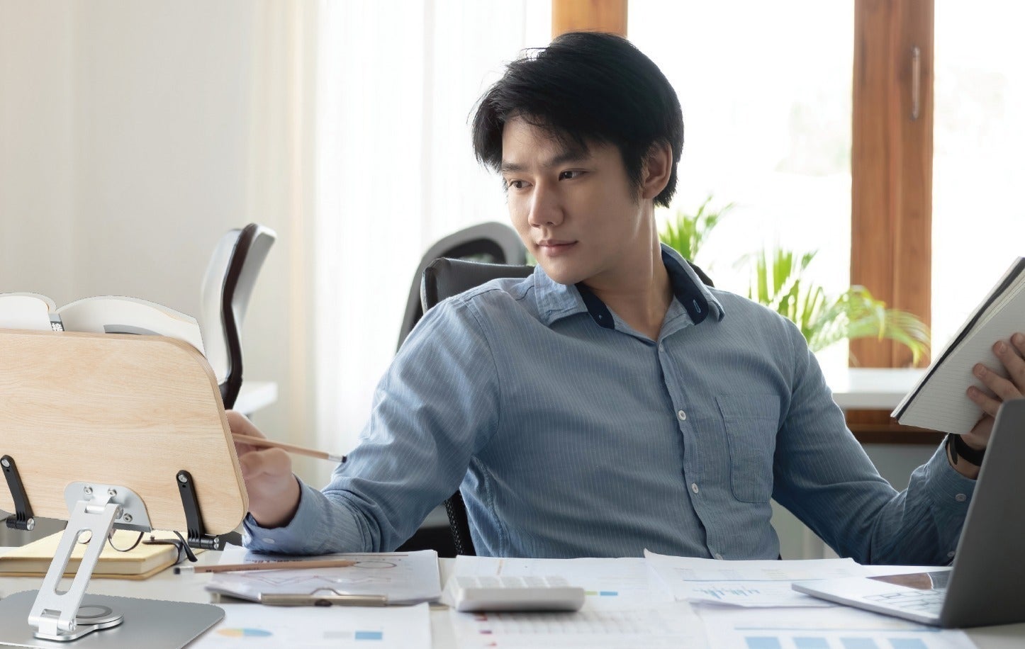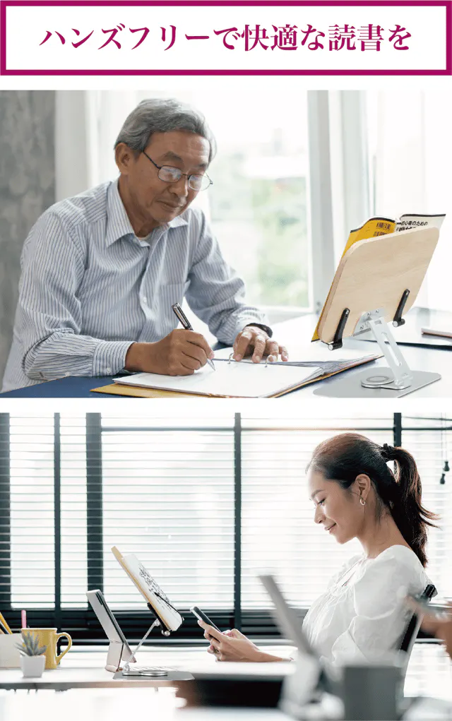【リブレリア】があればハンズフリーで読書ができるので、本を読みながらメモをしたり、スマホやパソコンを見ながら資料を見たり、ストレスなく読書に集中できます。本だけでなくスマホやタブレットのポータブルスタンドとしても利用できます。