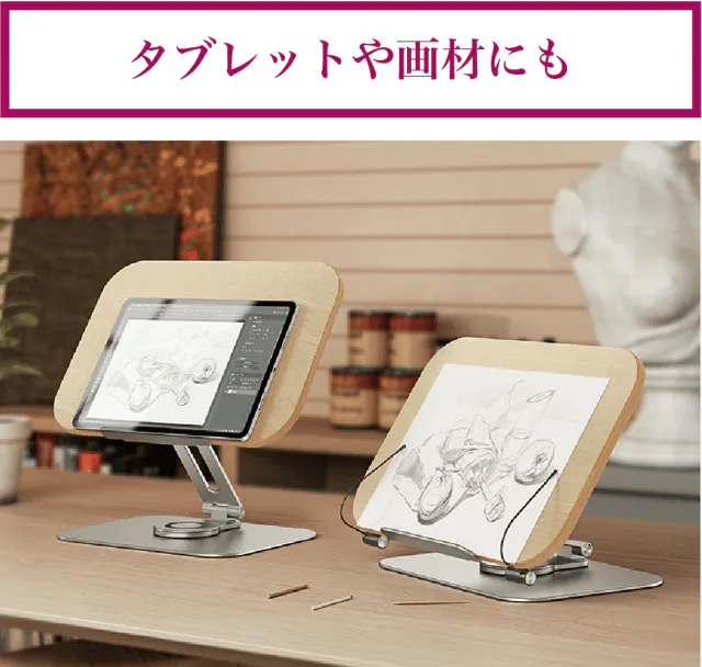 【リブレリア】はスマホやタブレットのポータブルスタンドとしても、またデッサンやデザインなど趣味の小さなイーゼルとしても利用できます。使用環境に応じて高さや角度を自由に設定できるのでとても便利です。