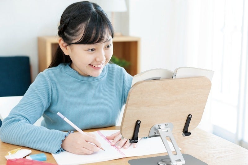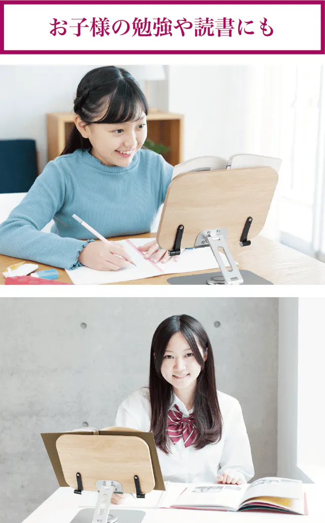 机の上に本を置いて読むと、どうしても猫背になりがちです。読書に夢中になりすぎて首や肩が凝っているなんていうことありませんか?【リブレリア】なら自然な目の高さに本を置けるので、読書の姿勢を楽に正しく保つことができます。本を抑える必要がないので、メモを取ったり、辞書や参考書を見ながらレポートをまとめたり、事務仕事や勉強にも効率的です。また、エッジ部分が丸くなっていて尖った部分がないので、お子様にも安心してお使いいただけます。