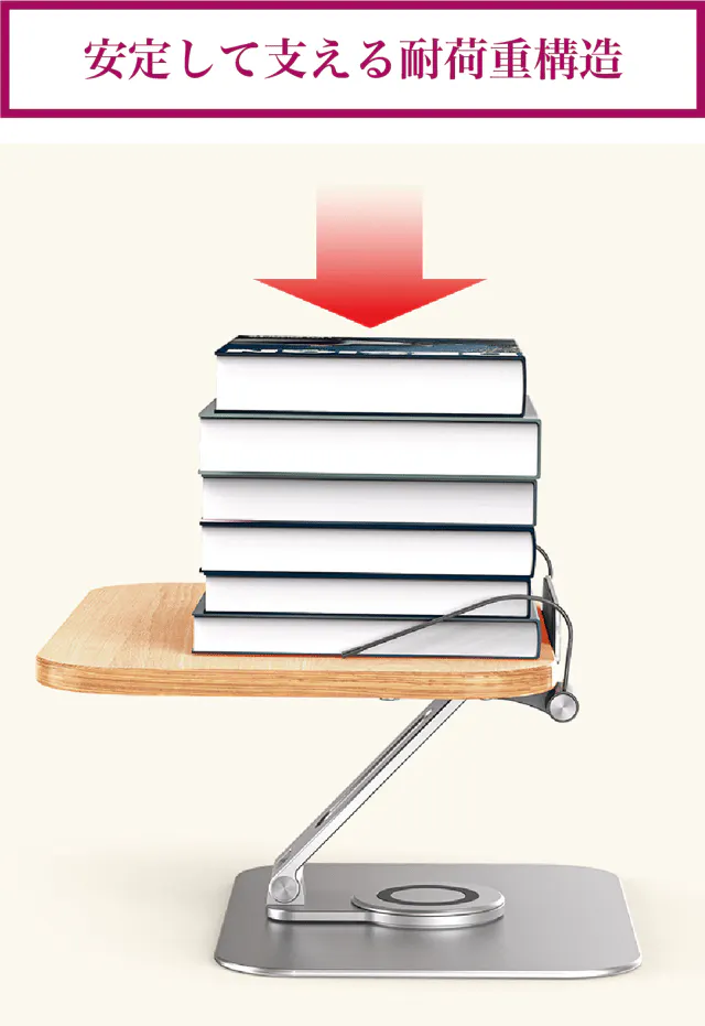 【リブレリア】は精密加工アルミ合金の軽量にも関わらず、しっかりとした耐荷重構造なので、百科事典や画集・写真集などの重い本も安定して支えます。