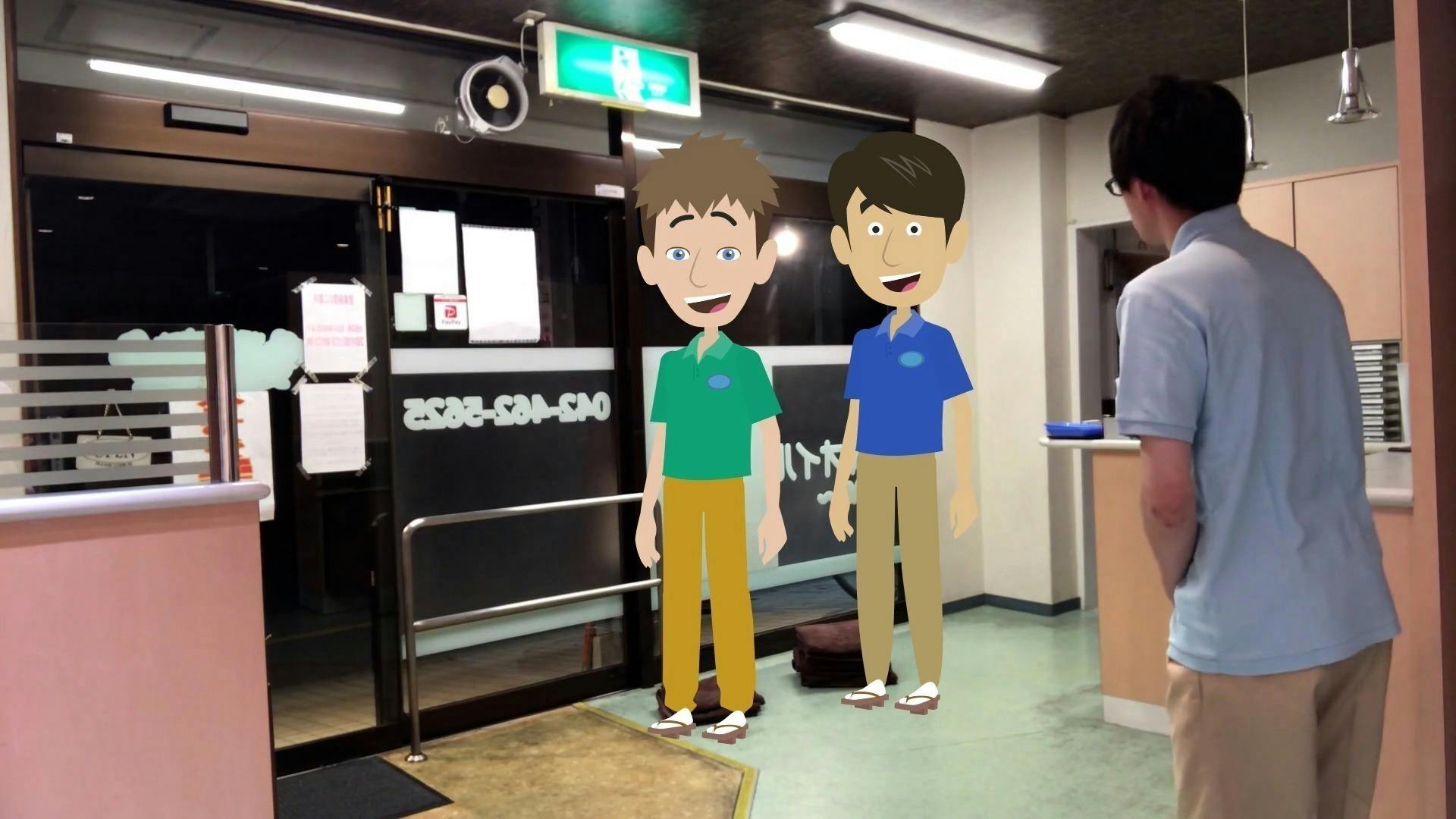 撮影終了後、取れた実写の映像にアニメのキャラクターを挿入します。そのキャラクターの口に合わせて、セリフを喋って頂きます。