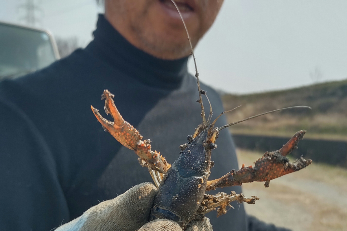 ゆにわの里の田んぼでザリガニ発見! カエルやネズミもいます。