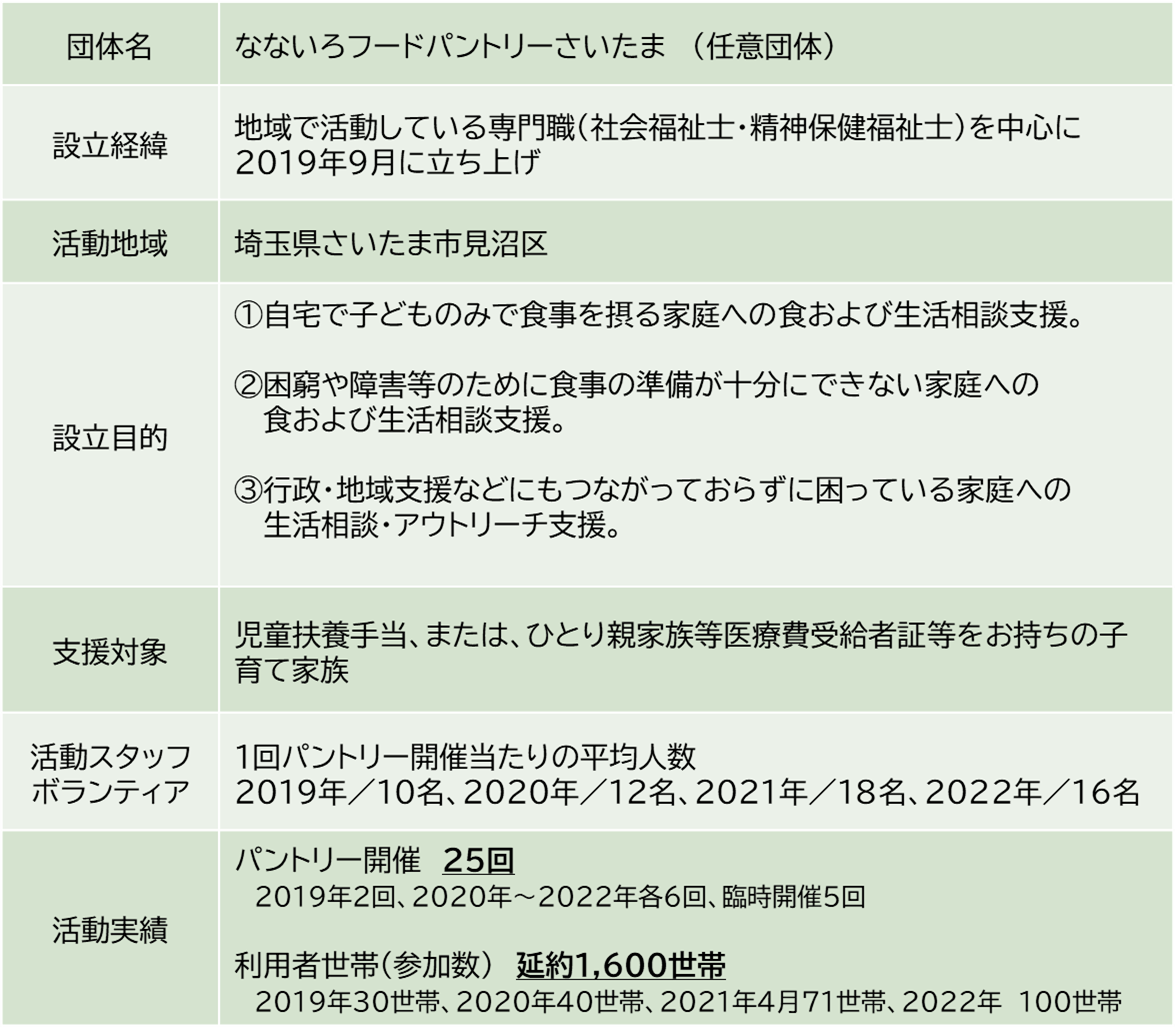 私たちは、埼玉県さいたま市で活動している「なないろフードパントリーさいたま」と申します。