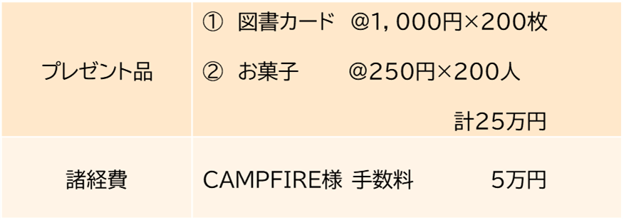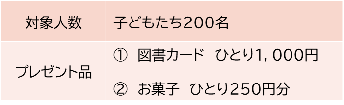 200名の子どもたち1人ひとりに、進級・進学のお祝いとして図書カード1,000円分とお菓子を手渡したいです。