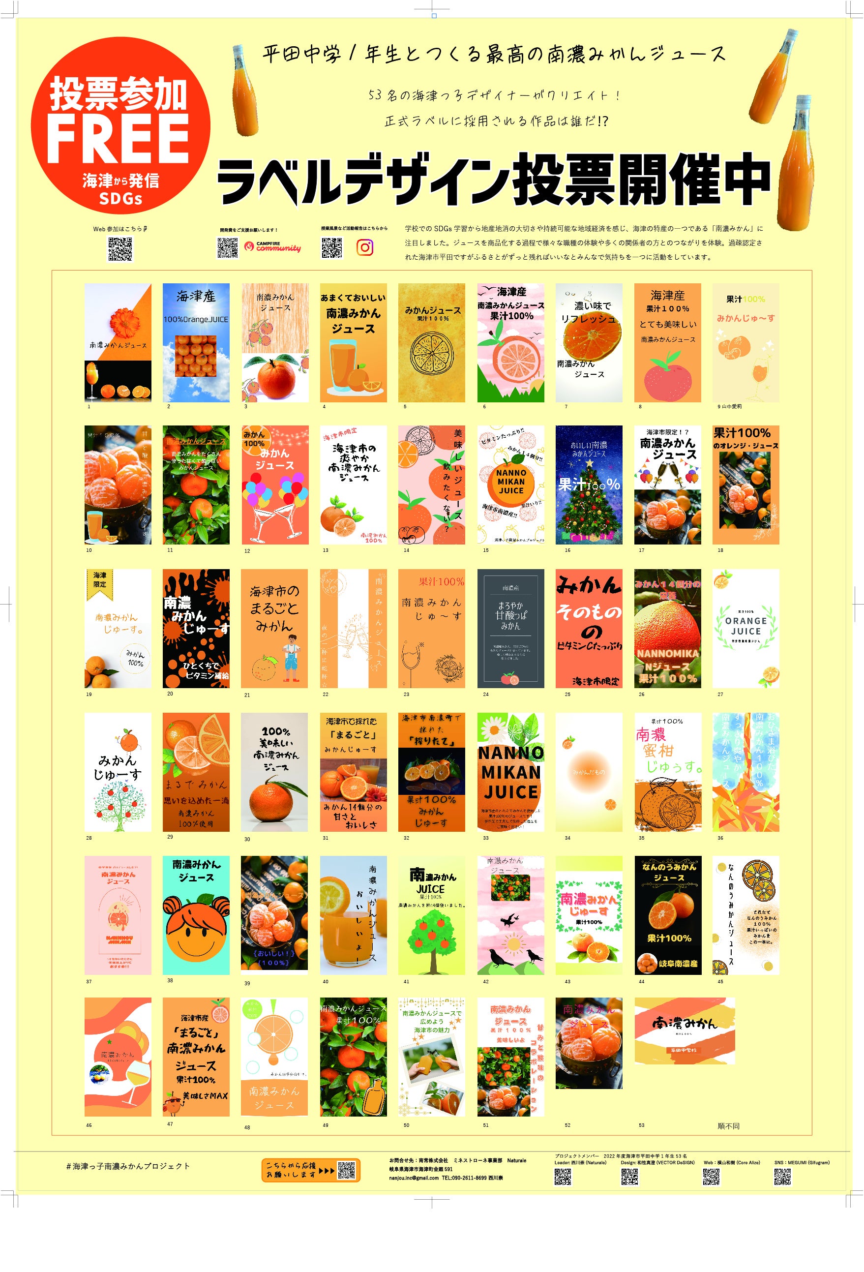 皆様にご支援いただきました本プロジェクト、ファーストゴールは早々に達成し、ネクストゴールに向けても本当に多くの方々にご支援いただけ本当に感謝しかありません。ラベル投票会で1番に選ばれた海津っ子のラベルもブラッシュアップ完成。本番ラベル用にみかんの画像もプロ機材(コアライズ横山さん提供)で自分たちで撮影したり、illustrator作業もOnline 授業でプロデザイナー(ベクトルデザイン和性真澄)と一緒に体験。海津っ子の活躍の集大成ももうすぐ完成いたします。皆様のお手元には3月上旬到着を予定しております。今しばらくお待ちくださいませ。*今後の販売は「ふるさと納税」「Onlineshop」「道の駅」「アンテナショップ」等で行う予定です。皆様の応援なしにはこのプロジェクト成り立ちませんでした。こんなにも楽しくみんながモチベーション高く活動させていただけたこと本当に感謝しております。海津っ子の楽しい想い出にもなりました。本当にありがとうございました。プロジェクトチームを代表して。南常株式会社ミネストローネ事業部Naturale西川崇