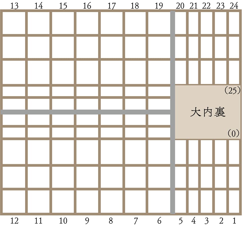 振り出しは0マス、あるいは25マスにあたり、大内裏(だいだいり)から脱出しないと他の駒を動かすことができません。