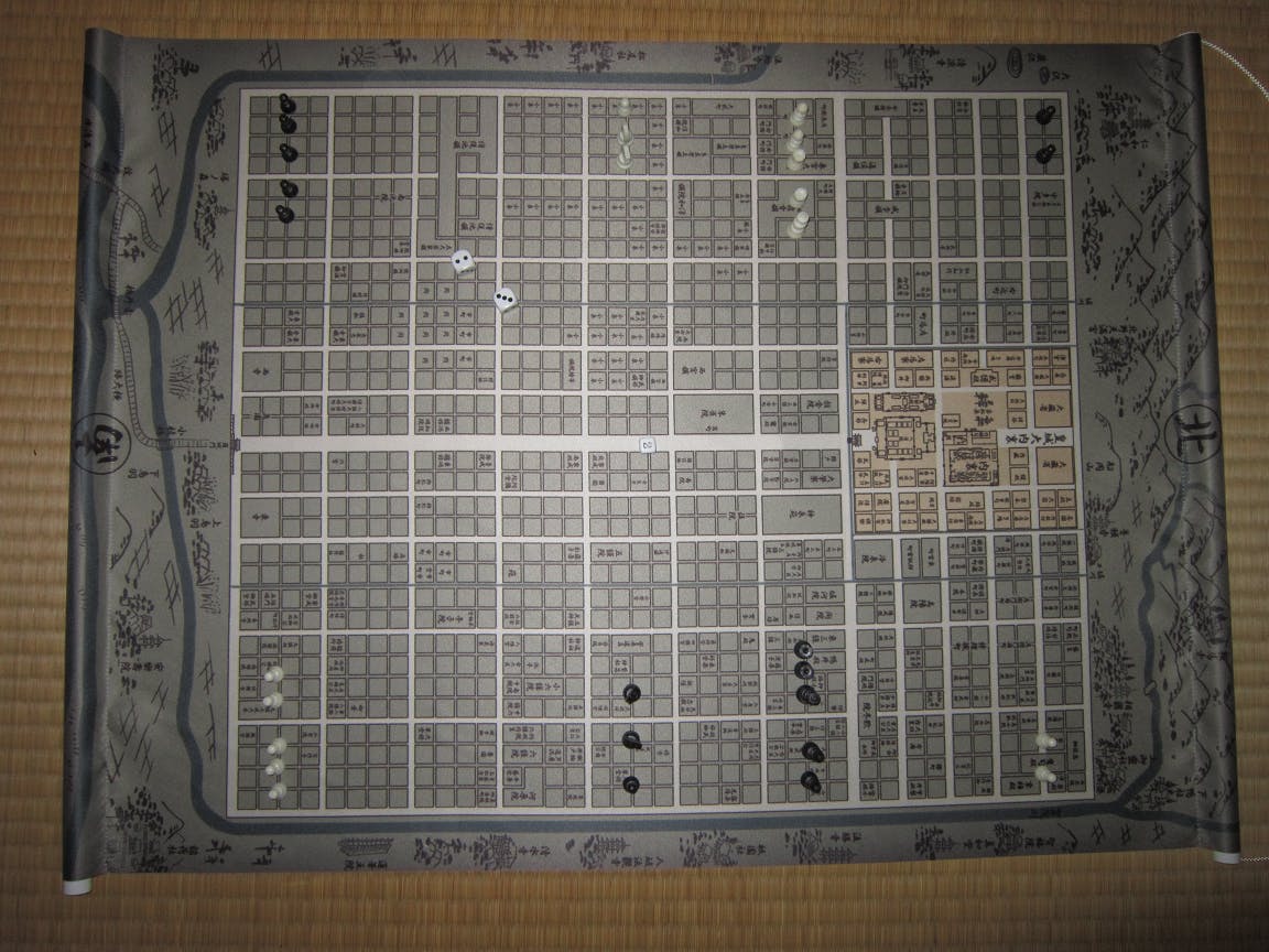 平安京バックギャモンでは、古地図をモチーフにした平安京ボードを横に倒してプレイします。
