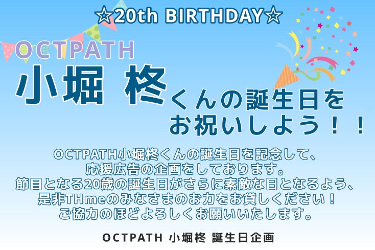 ※小堀柊くんのお誕生日当日にOCTPATHのライブがあるため、ビジョン広告の放映日については現在調整しております。なるべく多くの方が見に行けるよう、1日のみの場合はお誕生日翌日の2月12日、複数日放映の場合は2月10日〜2月12日頃を目処として進めております。