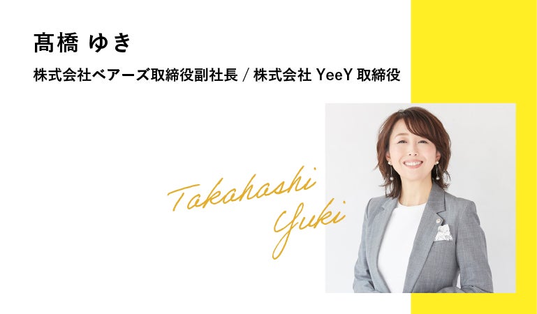 由香からバトンを受けました、株式会社ベアーズ取締役副社長、株式会社YeeY取締役の"ゆっきー"こと髙橋ゆきです。