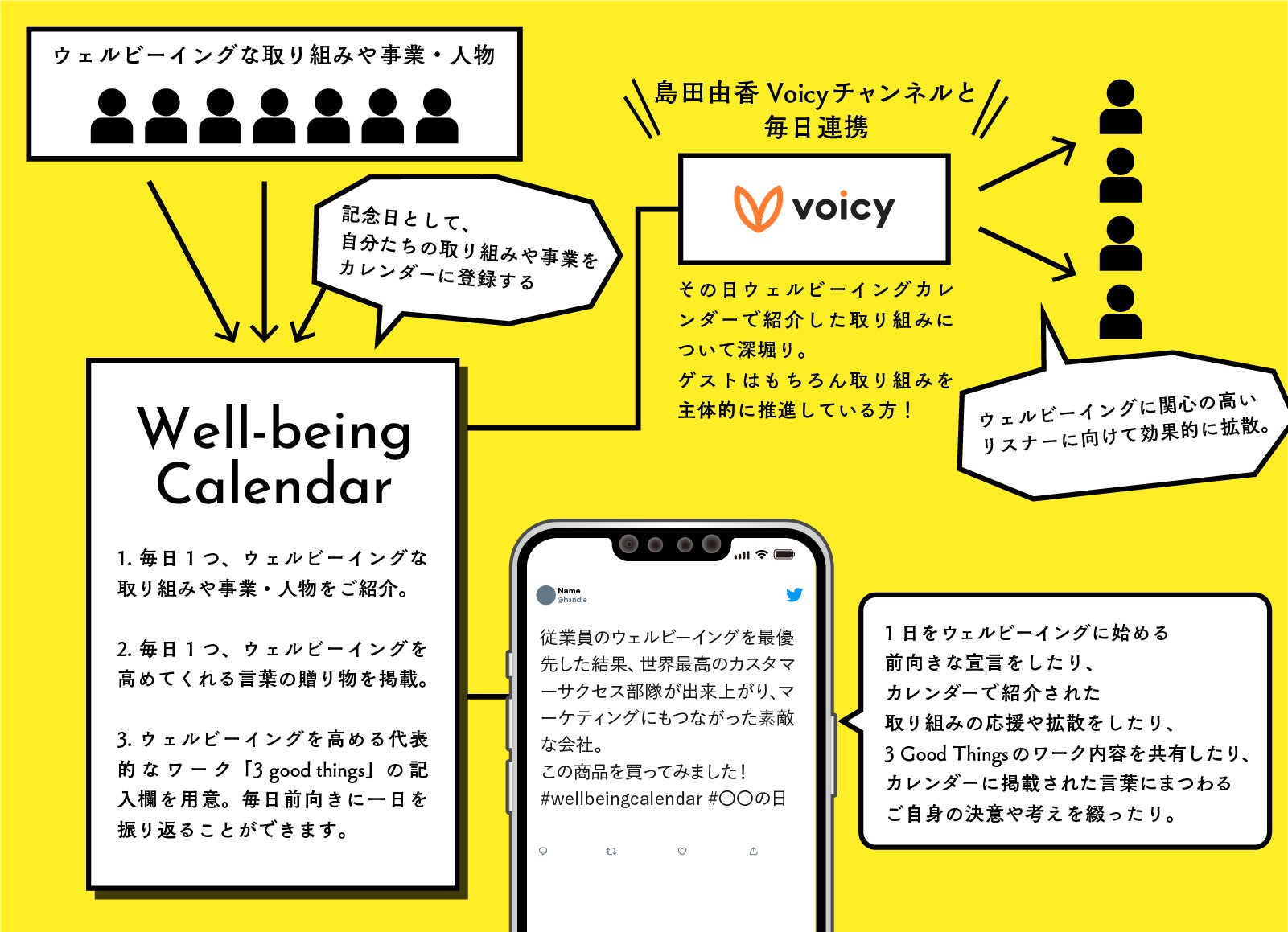 ①その日は、その取り組みの記念日としてカレンダーに掲げられます。(例:日本ウェルビーイングの日、や毎日1つウェルビーイングな取り組みや事業・人物をご紹介するなど)