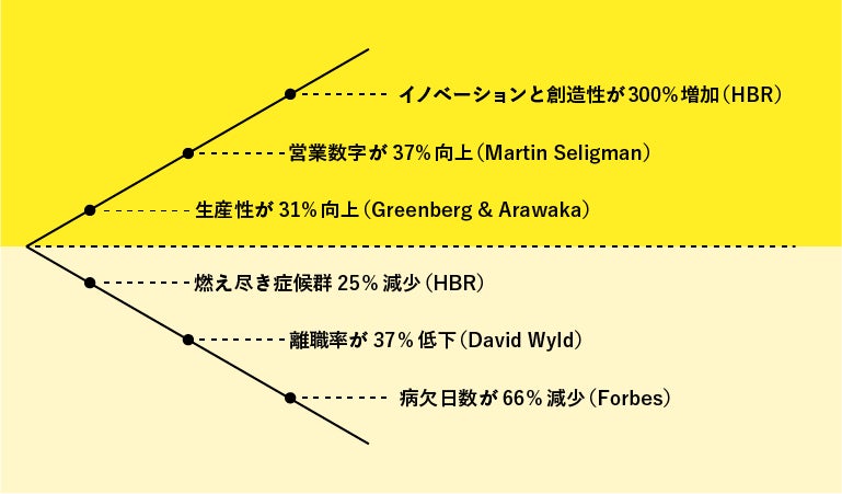 こちらの図は職場における社員のウェルビーイングが高いことでもたらされるさまざまな効用をまとめたものです。例えば、離職率が下がったり、燃え尽き症候群になる方が減ったりというのはイメージしやすいかもしれませんね。ただ、それだけではなく、生産性の向上や営業数字の向上、クリエイティビティに至っては3倍になるというリサーチ結果もあります。家庭や学校教育の現場においても同じような効用をもたらしてくれることは想像に難くありません。