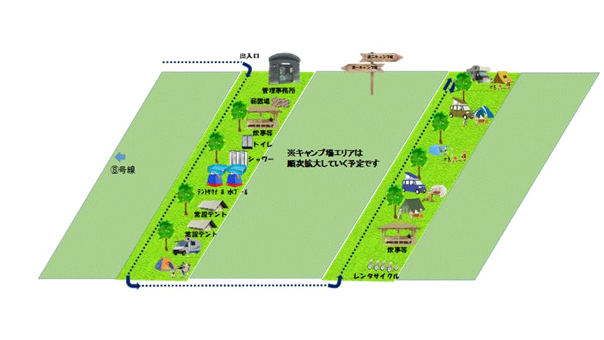 ハンモックやブランコなどを設け、あとは区画されたオートキャンプ場にする予定です。