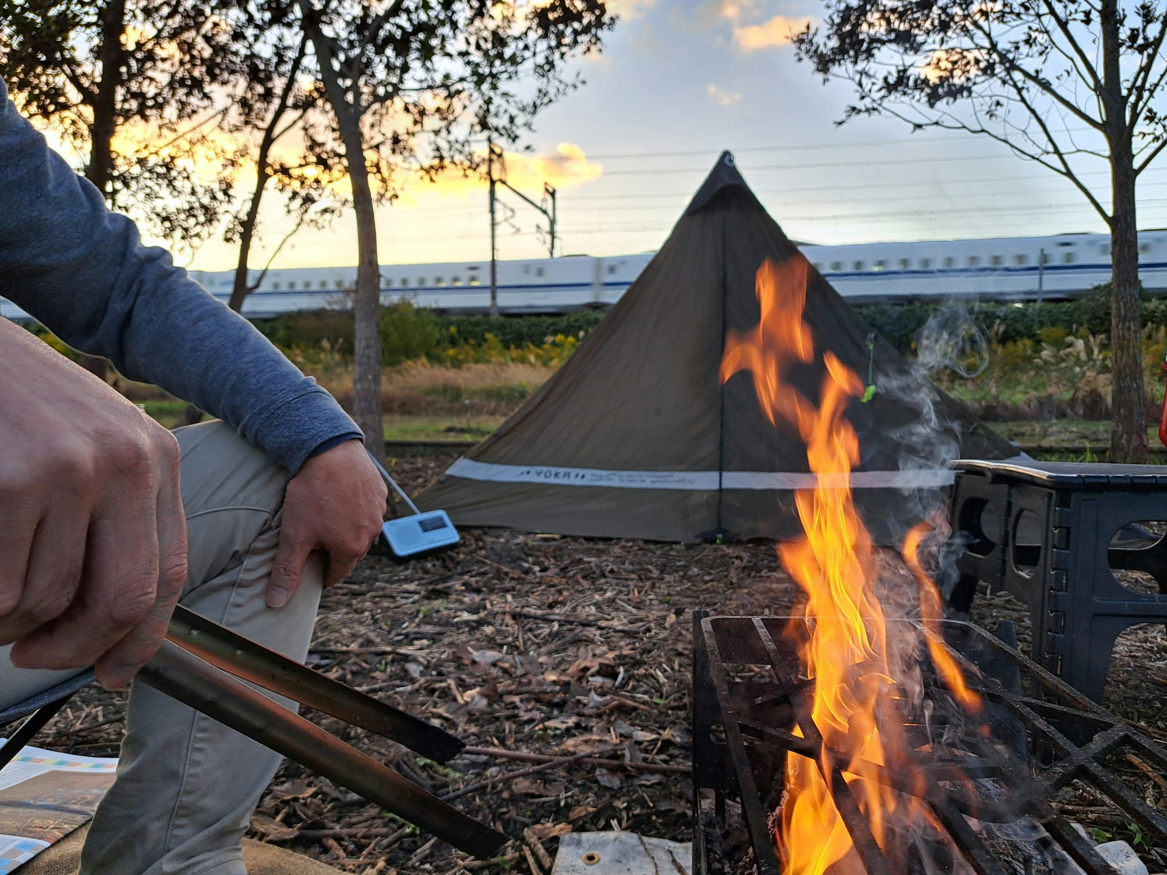 夜間は、その新幹線の明かりやフジテックの航空障害灯がお洒落で、一人キャンプの方など安心感があります。