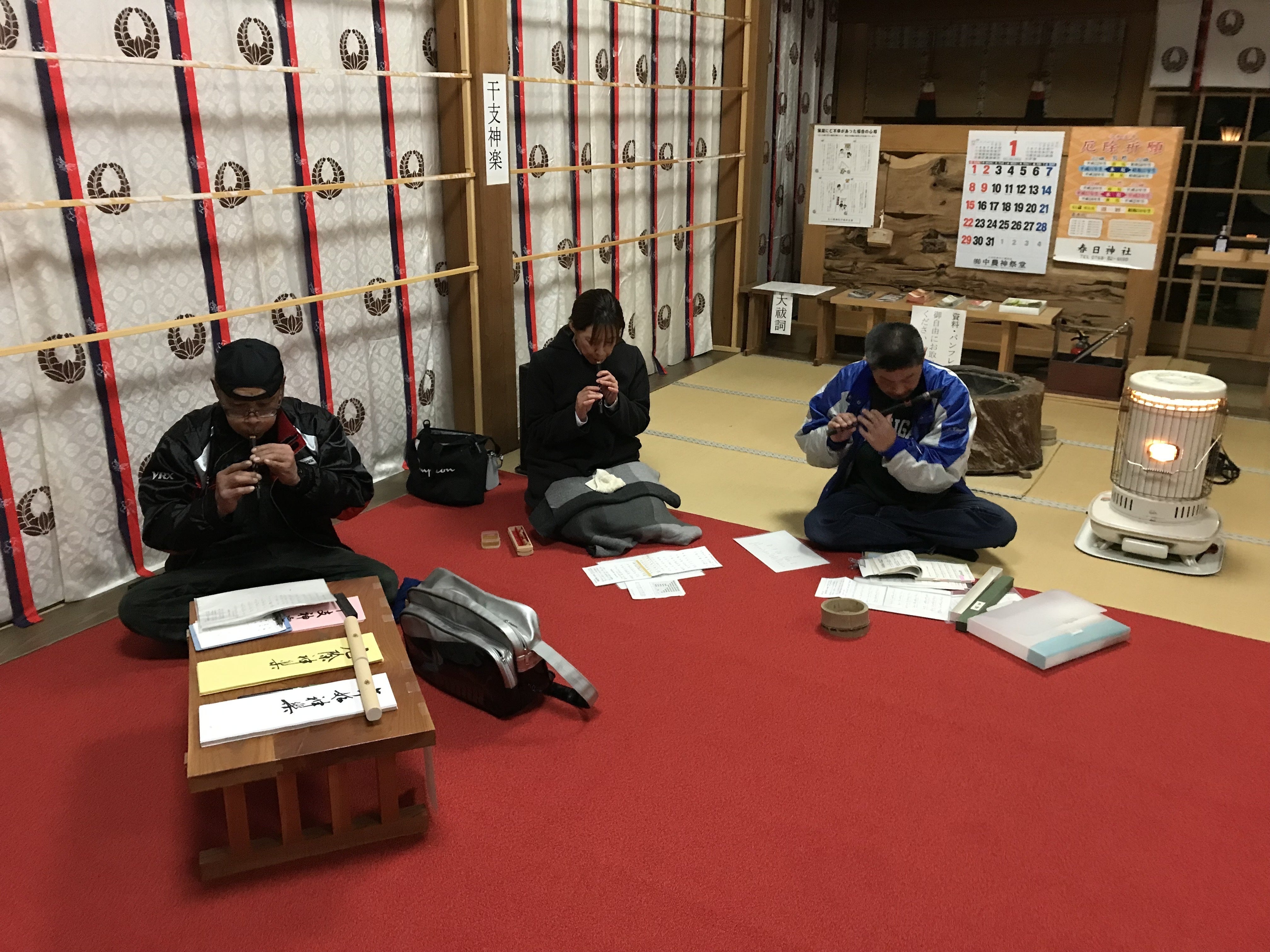 29日の夜、元旦の祭典に向けて雅楽演奏、巫女舞、宮司舞の練習を行いました。