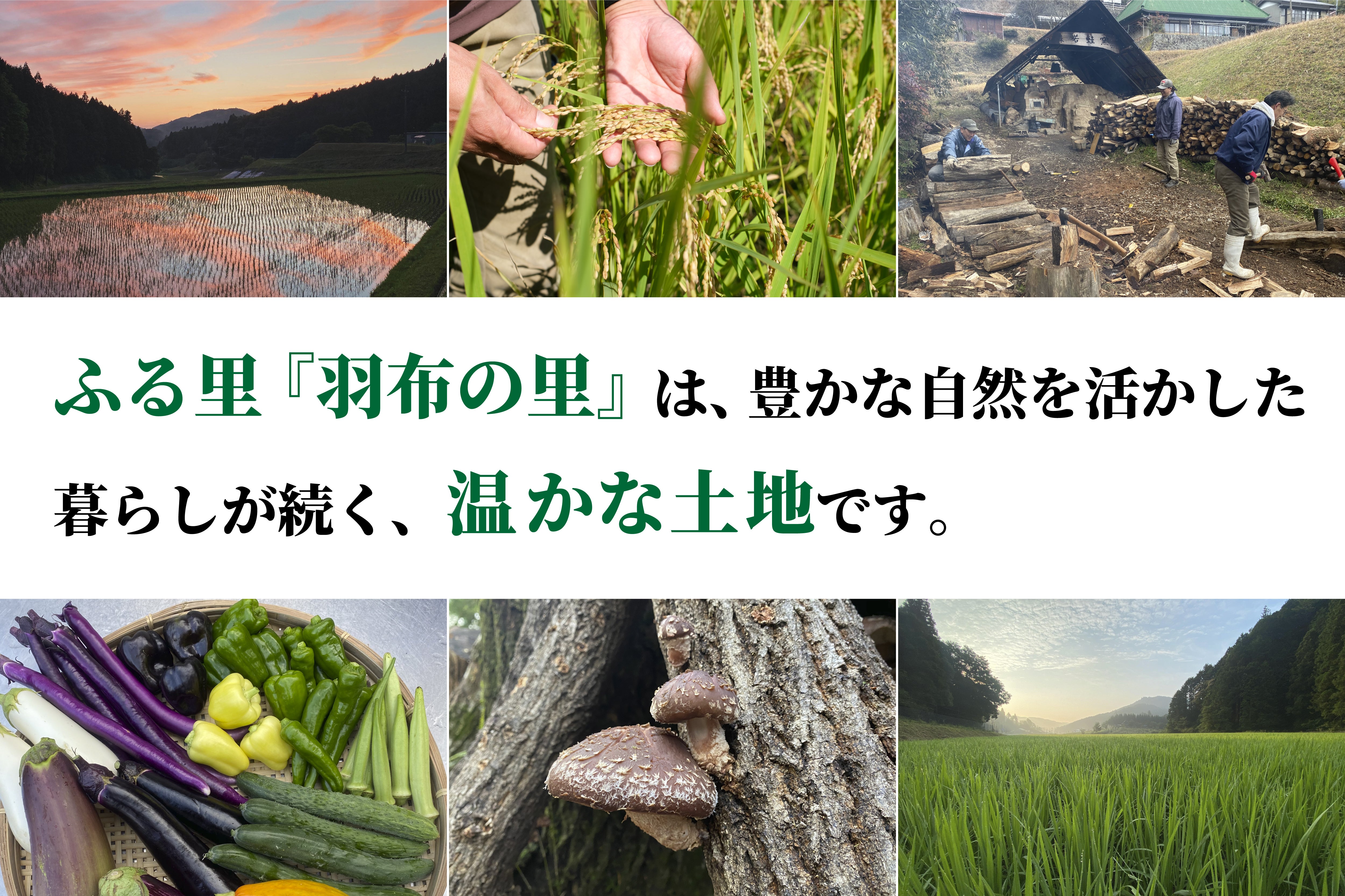 羽布町は、人口150人50世帯の小さな集落ですが、みんなで炭焼きをしたり、原木椎茸を育てたり、自然の恵みを活かして暮らしを楽しむ習慣が残る、温かい土地です。
