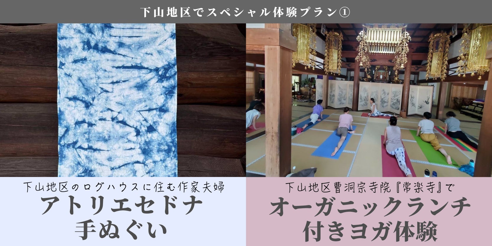 【下山地区でスペシャル体験プラン①】下山地区のログハウスに住む作家夫婦アトリエセドナの藍染め手ぬぐいと、下山地区曹洞宗寺院『常楽寺』でオーガニックランチ付きヨガ体験のセットです。